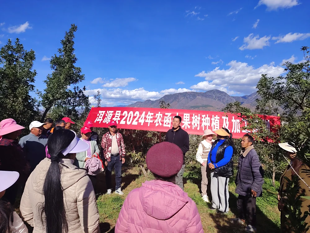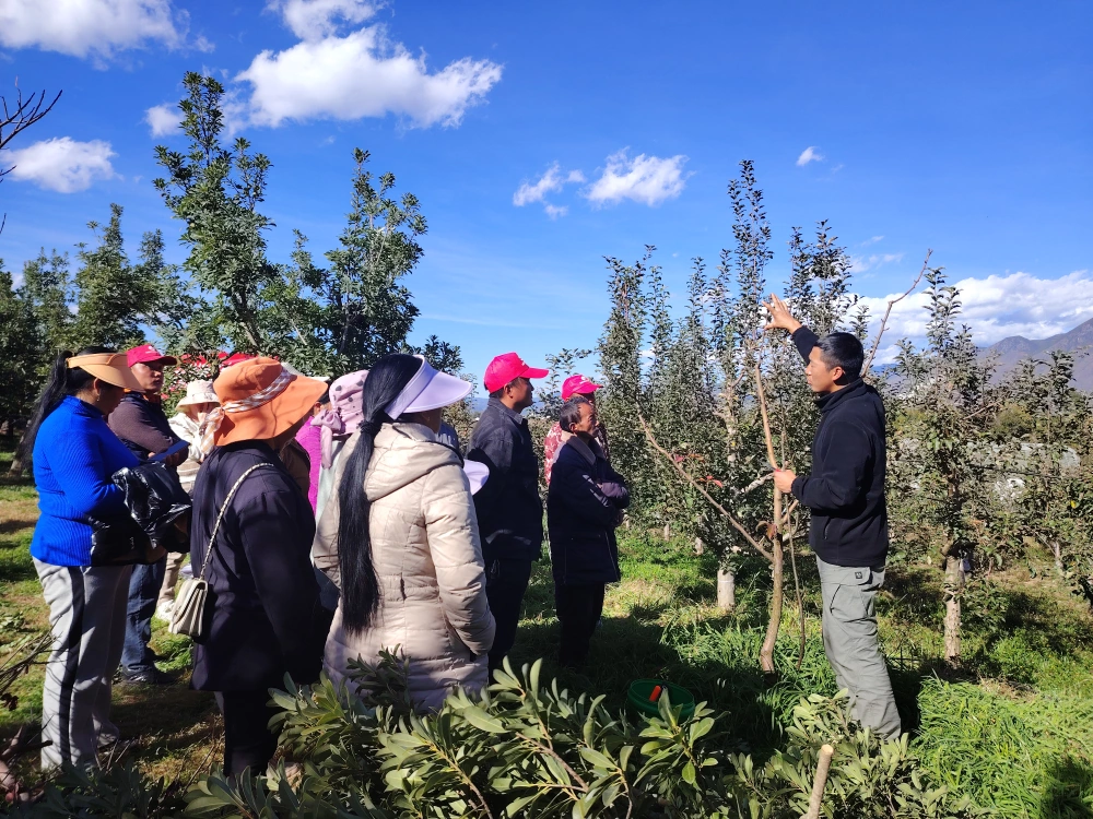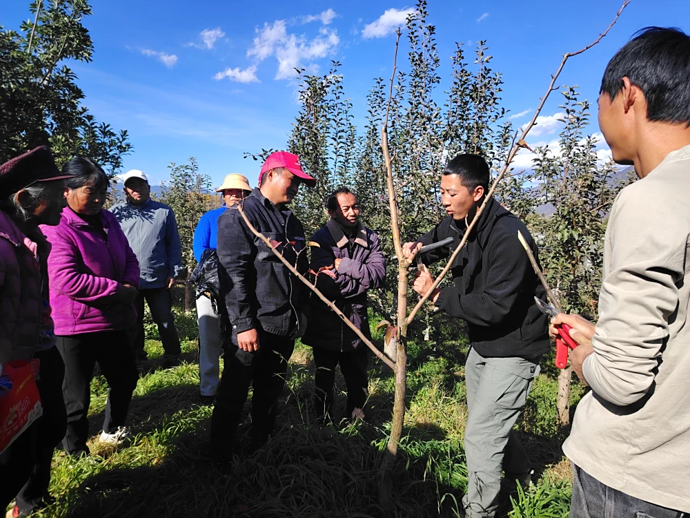为助推乡村振兴、洱海保护等工作,洱源县洱园红苹果种植技术协会积极发展绿色生态苹果种植,通过培训让果农们更好地掌握果树的种植和管理技术,提高果树的产量和品质,增加农民收入。2024年11月26日,洱源县科协联合洱源县洱园红苹果种植技术协会,在永乐村示范基地,组织开展洱源县2024年农函大果树种植及加工技术培训,洱源县洱园红苹果种植技术协会凌体超同志带领培训学员深入到果园手把手教学,从果树栽植、定杆、拉枝、刻芽、施肥、植保、修剪等整个管理,向果农们作了详细的技术指导、培训和交流等活动,通过实际操作的方式让广大果农获得更好的技术,进一步激发了果农发展产业的积极性。