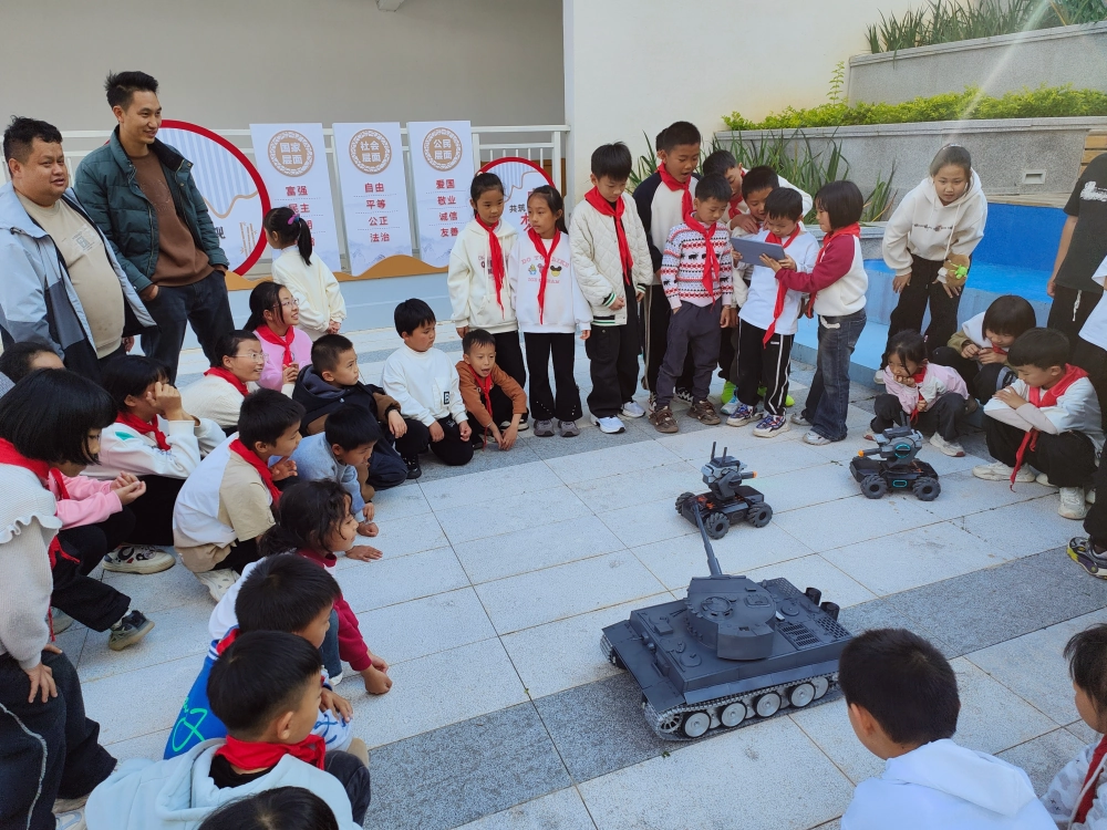 科普志愿者一边操作一边为大家讲解了坦克的机械结构、传动原理、电子控制等知识,培养学生的动手实践能力、创造力和对科技的兴趣。“机甲大师” “四足机器人” 等各类丰富展品也纷纷亮相,“机甲大师” 充满创意、奇妙互动;“四足机器人” 憨态可掬,聪明活泼。同学们看得眼花缭乱,直呼过瘾。“老师,‘3D打印RC坦克’真是3D打印机打印出来的吗?都由哪些零件组成?” “老师,‘机甲大师’可以作战吗,我想试一试” “老师,‘机器狗’好萌,我可以摸一摸它吗?” ......在科普志愿者的耐心讲解和示范中,同学们边观看、边思考、边体验,科学的种子悄然扎根在大家心间。