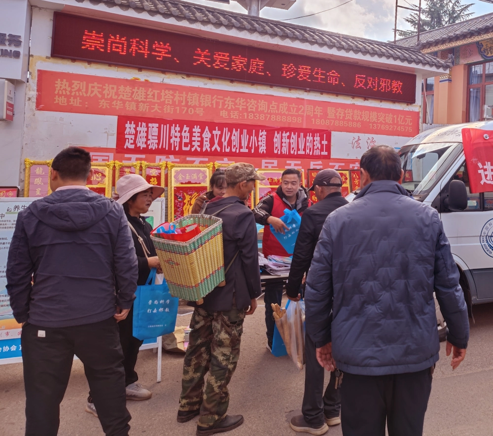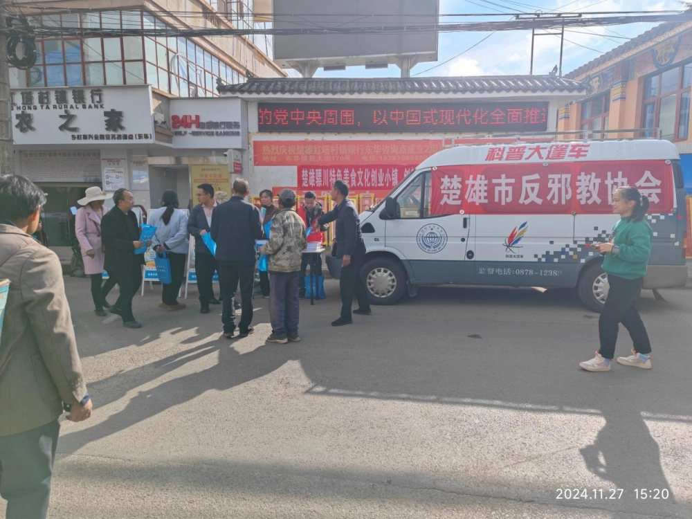 为深入推进反邪教宣传教育,提升群众科学文化素养和防范抵制邪教意识,远离邪教危害,营造良好的社会氛围,2024年11月27日下午,楚雄市反邪教协会科普志愿服务队在东华镇开展“崇尚科学,关爱家庭,珍惜生命,反对邪教”科普宣传活动。