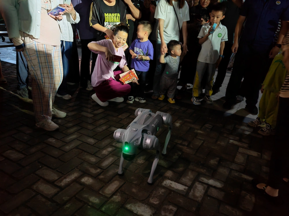 科技志愿者现场进行电子狗表演吸引了众多目光,赢得居民阵阵欢呼,为现场观众带来了一场视觉与科技的盛宴。