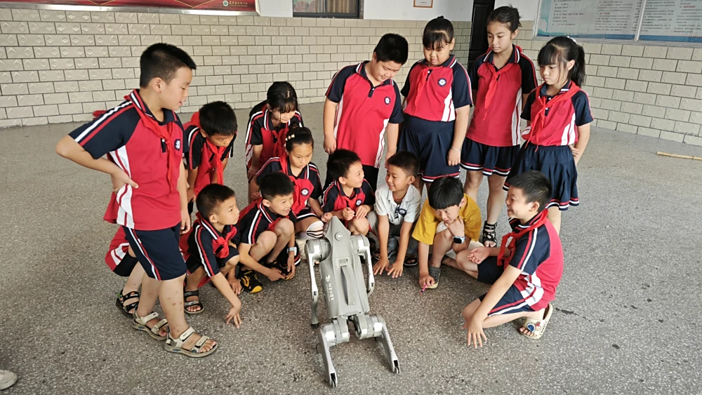 课后,科技志愿者们还带来了高科技“机器狗”与孩子们进行互动。前空翻、打滚、拜年、比心、伸懒腰、爬楼梯各个动作衔接的行云流水,围观孩子们纷纷鼓掌叫好,眼神中都充满了好奇与喜悦,科技志愿者则借机为孩子们剖析机器狗的构造,科普着机器狗各种仿生动作蕴涵的科学原理。