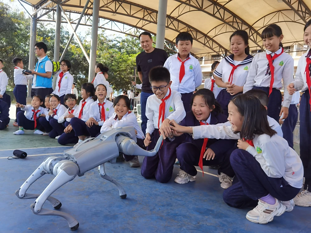 “机器狗”互动环节更是将活动氛围推向高潮。科普老师熟练操控机器狗,展示其攀爬、跳跃、卖萌与打招呼等精彩技能,逼真的表现令同学们惊叹不已,掌声与欢呼声此起彼伏。随后,同学们踊跃参与机器狗的操作体验,近距离感受高科技的神奇魅力,内心深处对科学奥秘的探索欲望被进一步点燃。