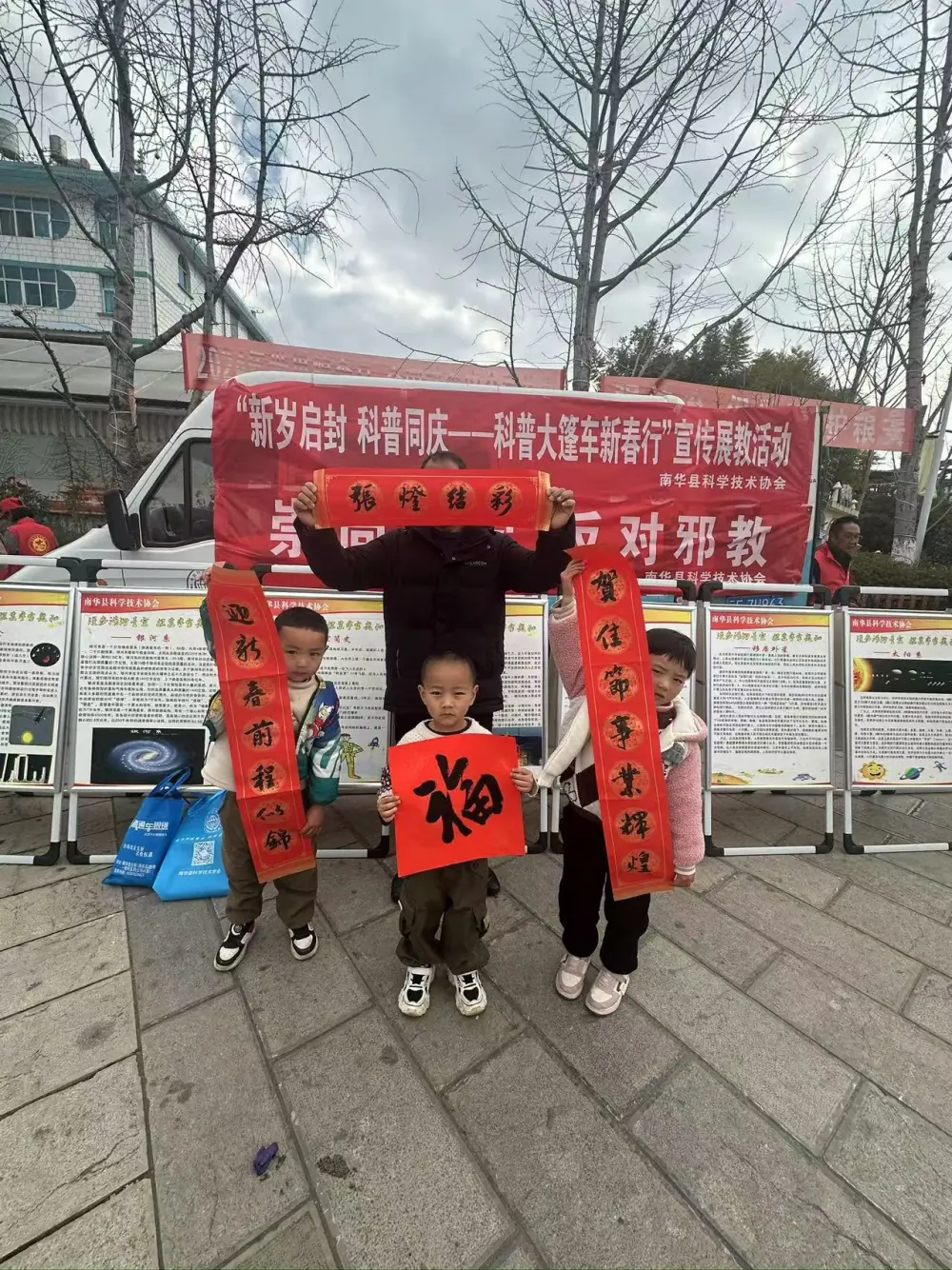 此次活动中,南华县科协利用科普大篷车展板展示宣传标语、发放宣传手册,向群众进行反邪教知识宣传,宣传邪教对社会的巨大危害,普及基本法律知识,提高群众反邪教意识和知法、懂法、守法、依法、宣法的主动性,并邀请县书法协会的书法爱好者现场书写春联、“福”字,为广大市民”新春送福”。