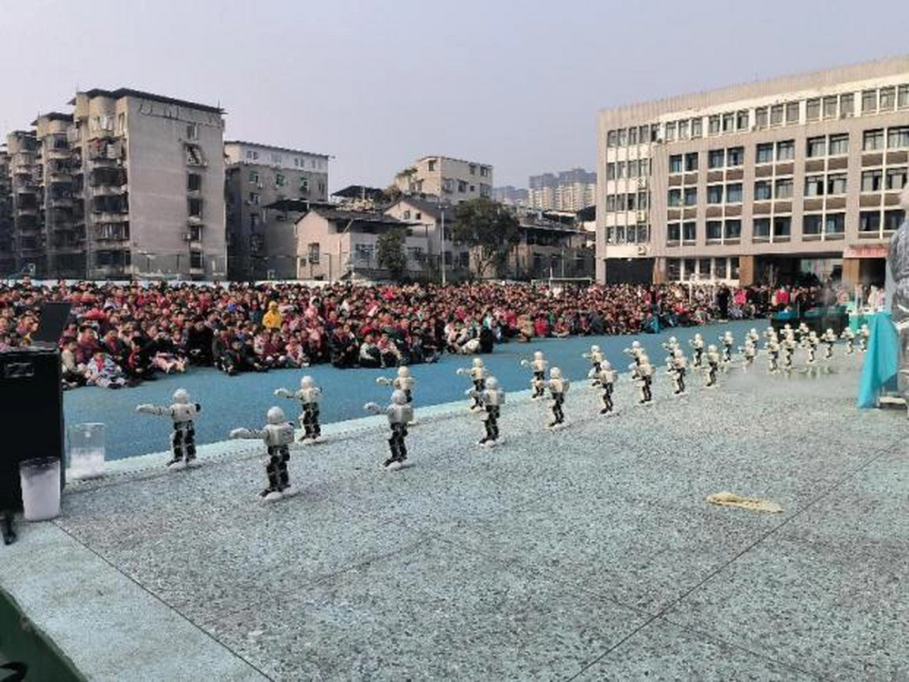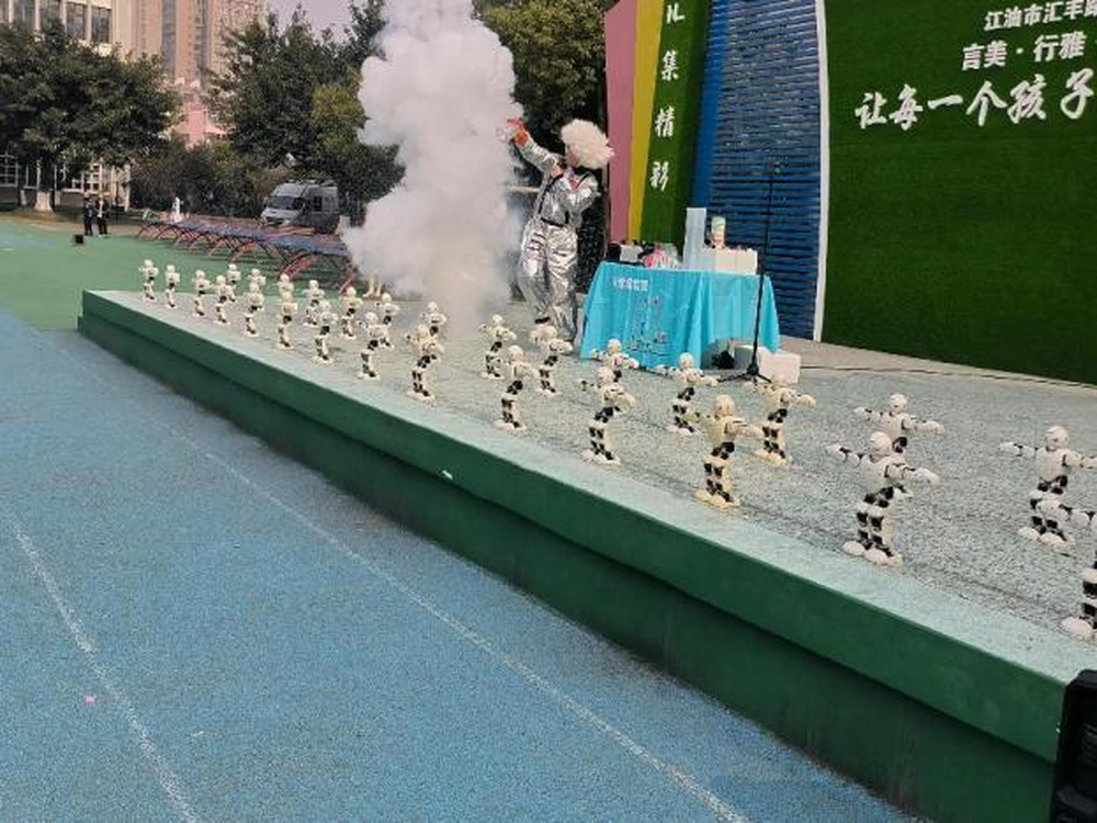 舞台上,无人机和机器人表演为同学们带来了一场视觉盛宴。伴随着动感的音乐,无人机在空中变换着各种队形,充分展示了科技的力量,引得学生们连连惊叹,也激发了学生们对飞行科技的无限遐想。小机器人表演同样精彩纷呈,它们在舞台上展示了各种灵活生动的动作,让孩子们切身感受到了人工智能的奇妙。
