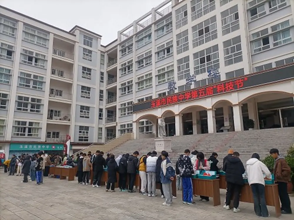 在玉溪民族中学的教学楼前的广场上,5辆科普大篷车并排停放,琳琅满目的科普展具有序摆开,声、光、电、力学、磁学等科普展具,思维训练展品、3D打印的坦克以及四足机器人等吸引了大量同学,同学们在快乐的体验中感受到了科技的魅力和创新的乐趣。