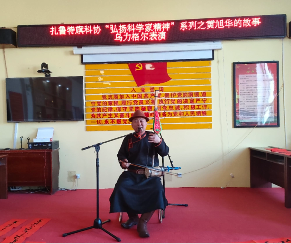 活动中,自治区级非遗传承人达布白拉一身民族盛装,演出科学家故事乌力格尔和民族团结的好来宝,科学家故事乌力格尔表演中,主要讲述了我国著名的船舶专家、核潜艇研究设计专家黄旭华的故事,讲述科学家为保密研发核潜艇,隐姓埋名三十年,扎根科研一线,研发核潜艇技术的精神与毅力;民族团结进步的好来宝表演中,赞美各民族平等团结,倡导各民族交往交流交融,将“四个与共”、“五个认同”和“六个相互”等铸牢中华民族共同体意识理念融入好来宝内容当中。