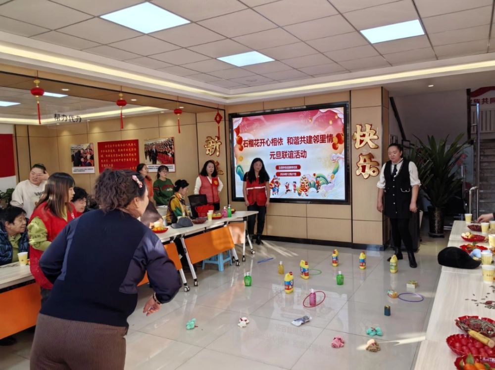 随着2025年元旦的脚步日益临近,华苑社区全体工作人员精心策划了一场“情暖社区迎元旦,共筑和谐邻里情”庆元旦、迎新春趣味活动。活动现场,社区表演团队队员们身着节日盛装,随着欢快的音乐节奏翩翩起舞,用灵动的舞姿和灿烂的笑容点燃了现场气氛,趣味活动也在充满欢乐的氛围中拉开序幕。“母鸡下蛋”“你来比划我来猜”“击鼓传花”“气球运纸杯”等游戏不断将活动推向高潮,大家齐动手、展智慧,个个精神抖擞,乐享其中,现场欢声笑语不断,呈现了饱满的“精气神”与“年轻态”,营造了浓浓的节日氛围。