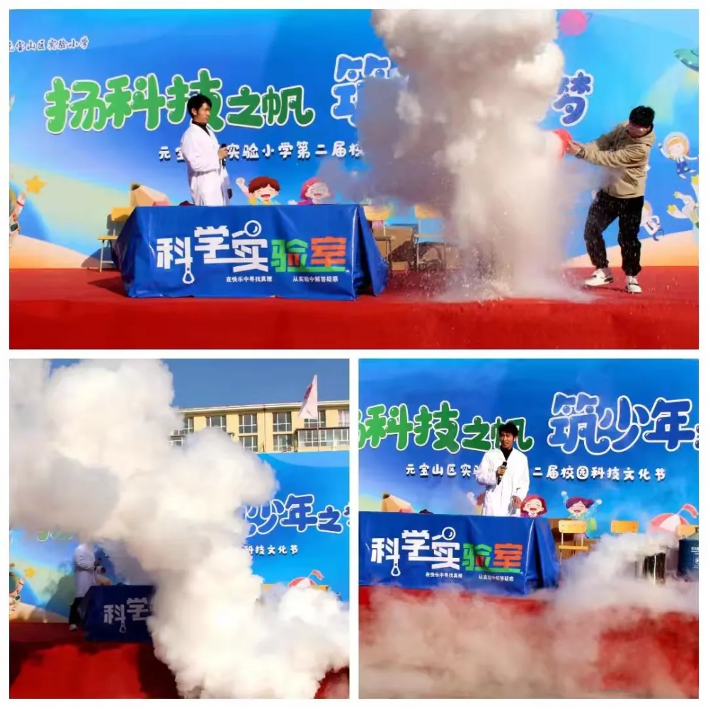 开幕式上,最引人注目的是林非凡老师为大家带来的一场非凡科学魔幻秀,液氮蘑菇云、火焰掌、马德保半球、塑料袋火箭等科学现象,激发了孩子们对科学的兴趣,感受了科学的趣味和神奇!欢呼声、呐喊声溢满校园,现场气氛拉满!