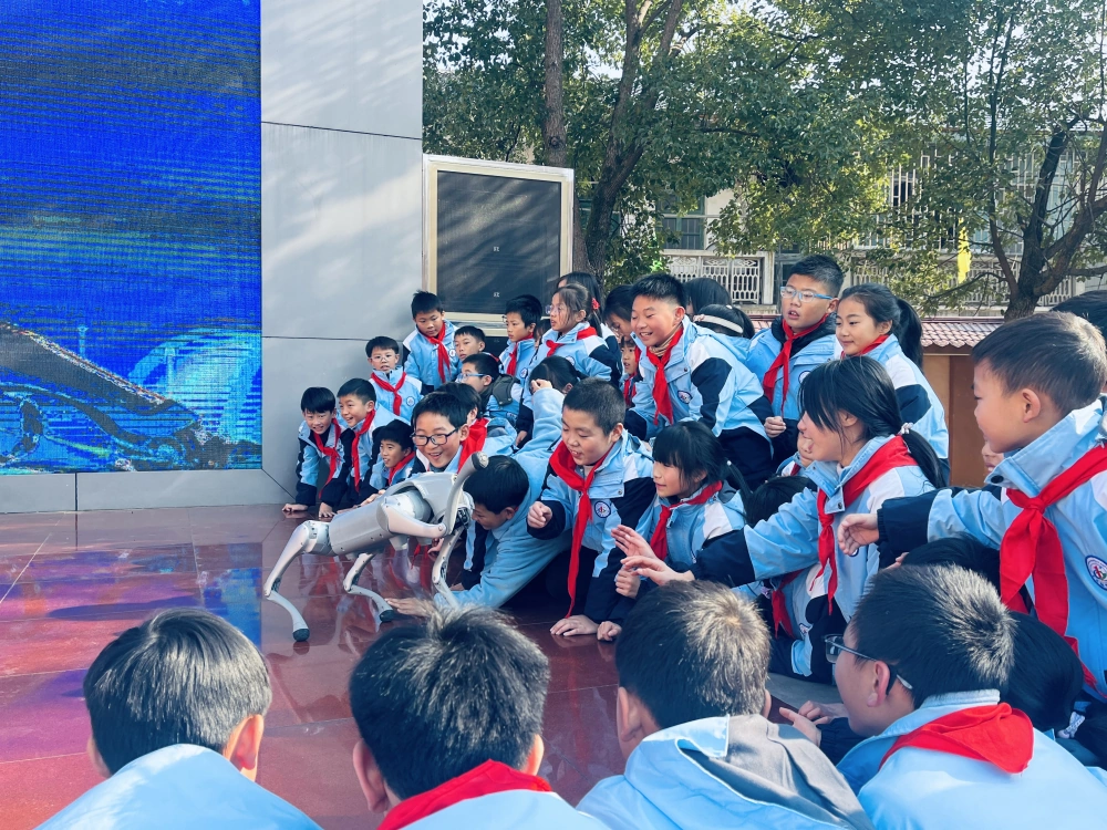 随后,机器狗表演成为了全场焦点,在志愿者的操控下,机器狗灵活地跳跃、翻滚、跟同学们互动,赢得了师生们的阵阵欢呼声。科普志愿者让同学们轮流操作机器狗,面对面、零距离体验亲自动手操控高科技设备的乐趣。