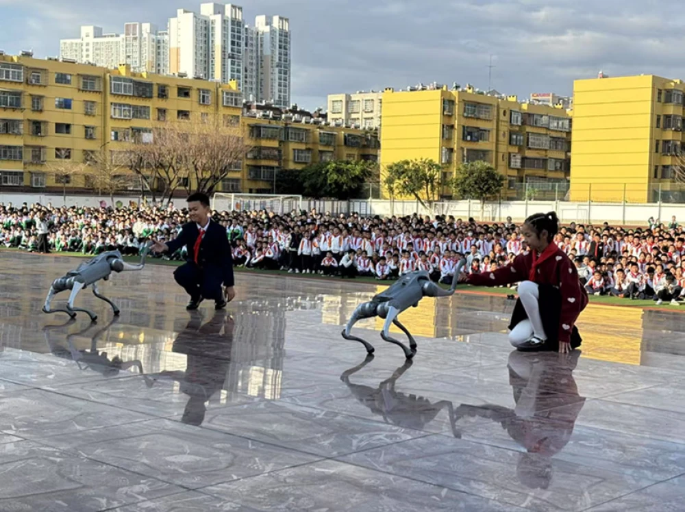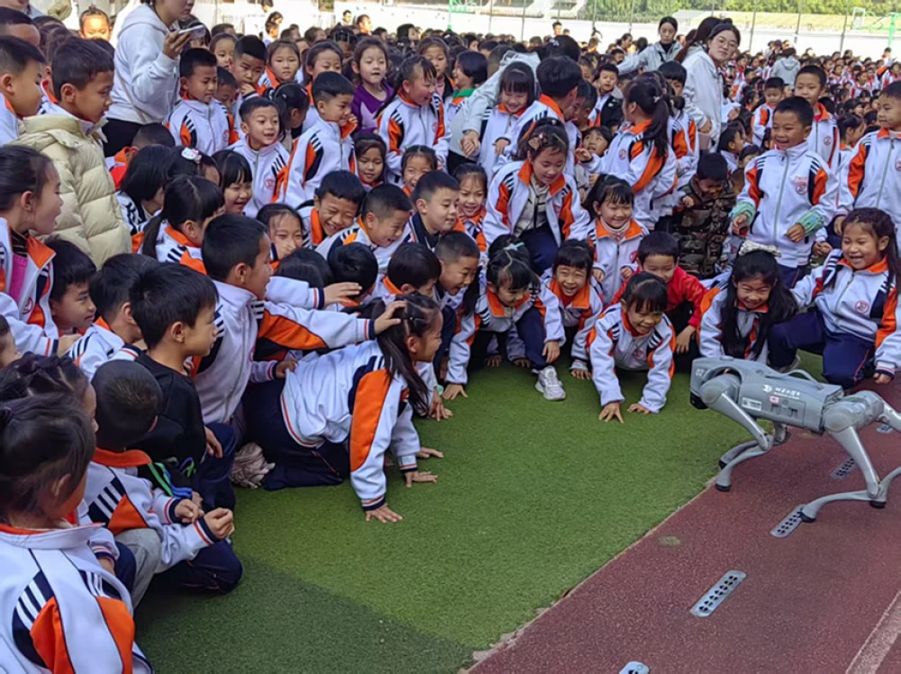 活动刚开始,校园里便传来了连绵不断的欢呼声和喊叫声,在操场中央机器狗C位出道,开学典礼秒变科技秀!机器狗像一个默契的伙伴,时而高高跃起,做出可爱又不失酷帅的动作,同学们眼睛里闪烁着兴奋与探索的光芒,他们围绕着机器狗被它逗得咯咯直笑,机器狗扬起的前腿,恰似在跟同学们挥手问好,同学们它指指点点,分享着自己脑海中的奇思妙想,他们脸上纯真的笑容成为了画面里最温馨的一抹色彩。通过机器狗表演,让同学们直观感受科技的魅力,有同学直呼“原来机器狗可以那么酷!我也想学人工智能”。