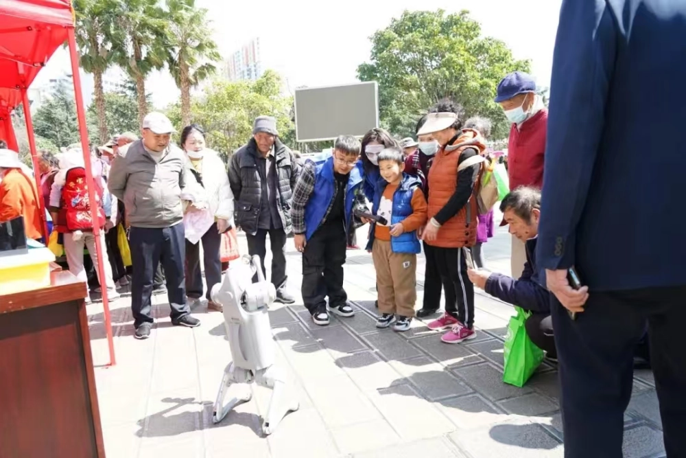 跳跃、比心、拜年、打滚……在科普志愿者的操纵下,机器狗伴随着欢快的音乐翩翩起舞,灵活多变的动作、憨态可掬的样子引得在场的孩子们一片欢呼,送上热烈掌声。活动现场,来自下关四小的孩子们还饶有兴趣地观摩了解VR眼镜等,认真聆听科普志愿者对科学原理的讲解。