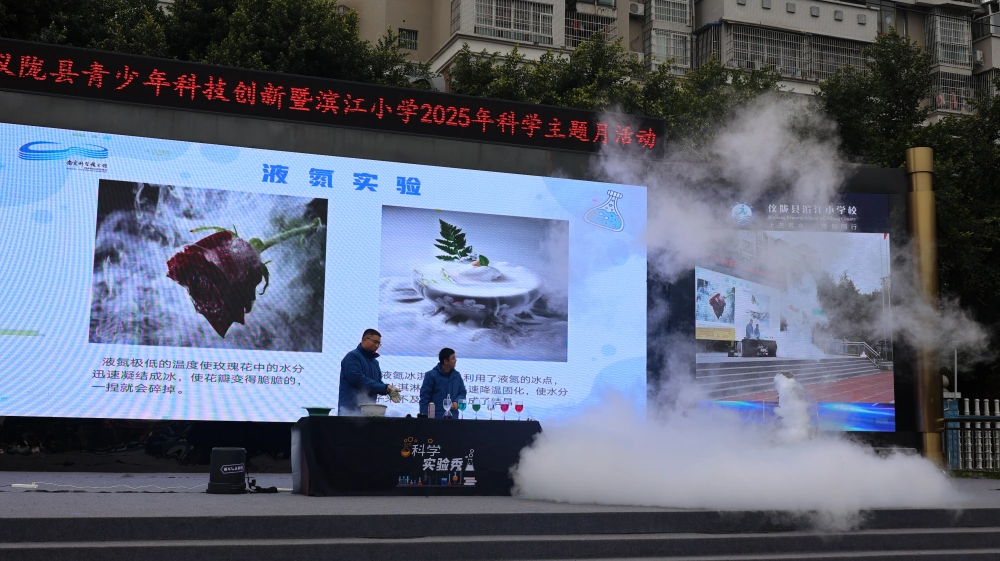 南充市科技馆的工作人员化身“科学魔法师”,带来了液氮冻花、空气炮等精彩实验秀表演,现场欢呼声此起彼伏,气氛热烈。