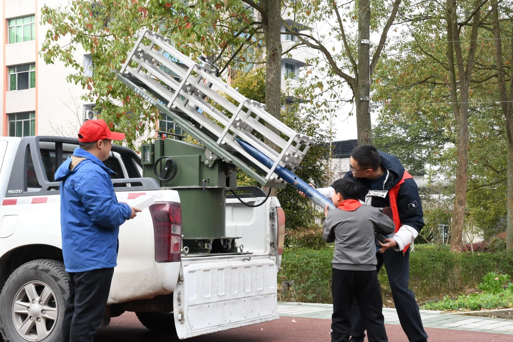 活动现场,县气象局陈家敏老师凭借扎实的专业知识和生动易懂的讲解,向同学们揭开了人工影响天气发射装置的神秘面纱,详细阐述了其工作原理和重要作用。随后,在陈家敏老师的带领下,同学们近距离观察气象发射设备,亲身体验气象发射的过程。这一环节让同学们深刻理解了科学在应对自然灾害、保障农业生产等方面的重要作用,极大激发了他们对气象科学的探索热情。