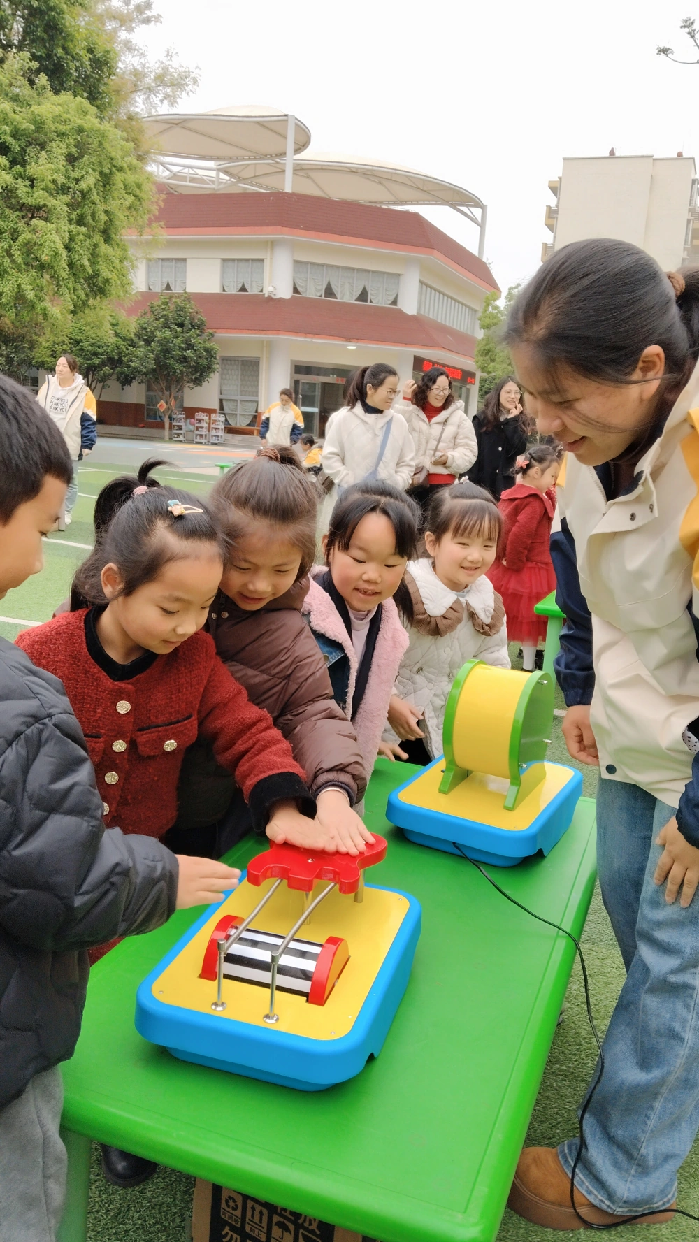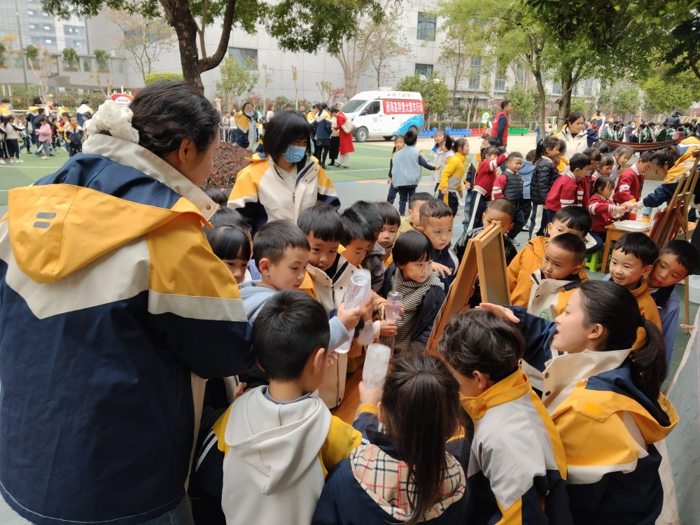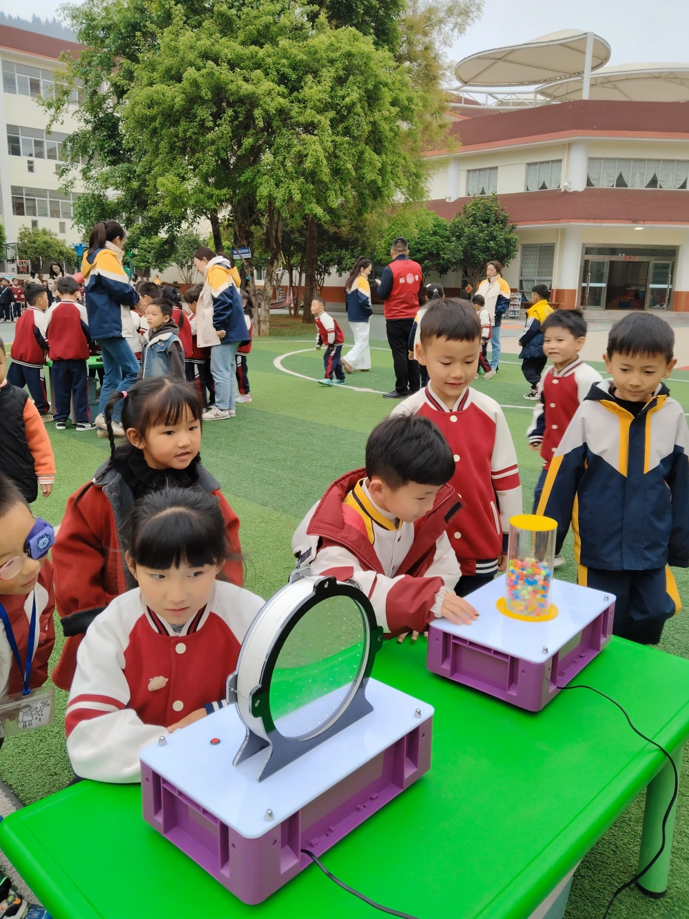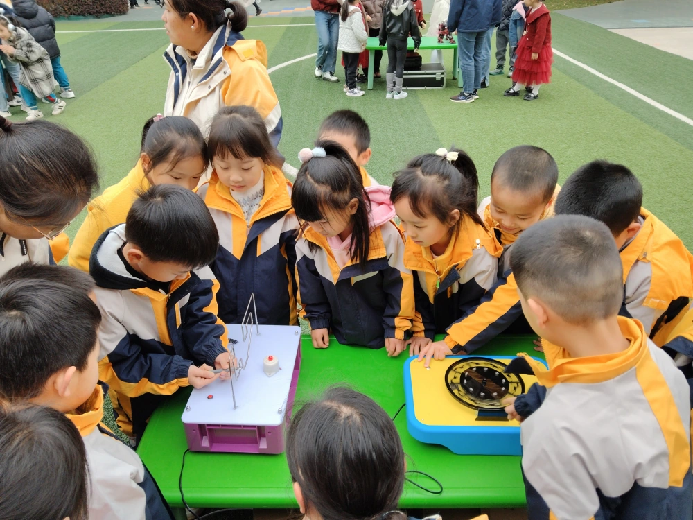 900多名幼童在教师、科普志愿者的引导下动手体验科普展具,好奇地投入到人机互动中,快乐体验科学,稚嫩的欢呼传遍校园。