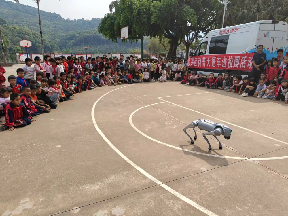 活动现场,“科普大篷车”变身“校园科技馆”,展出涵盖数学、力学、机械等领域的多种科普展品。保尔·加力正方形、六星数字谜题、五格拼日历等15套实践活动资源包吸引了学生们的眼球,他们踊跃参与,动手操作,感受科学的魅力。会唱歌、跳舞的机器狗更是成为了孩子们的玩伴,现场欢声笑语不断。一名小朋友兴奋地说:“老师,怎么办?以前,我长大后只想当军人,现在我既想当军人又想当科学家。”