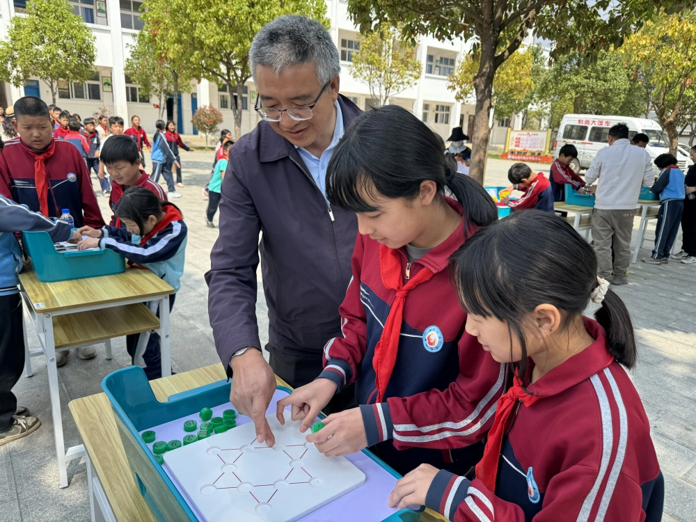 县科协在活动现场摆放了“五元正方形”“六仙归洞”“独立钻石棋”等桌面型展教具16套,在学校老师的安全引导下,学生们以年级或班级为单位有序参与。活动中,同学们仔细阅读展教具上的玩法解释,或自行组队、或独自挑战,在探索和实践中展开思考,认真学习展教具背后的原理。此次活动还为牛街乡牛街小学带去了《地震科普知识读本》《反邪教安全知识》等科普宣传材料400余份、科普益智学具“孔明锁”“九连环”共计20套。通过活动开展,进一步提升了巍山县青少年群体科学素质,激发了同学们对于科学的深厚兴趣,营造出崇尚科学、学习科学的良好氛围。