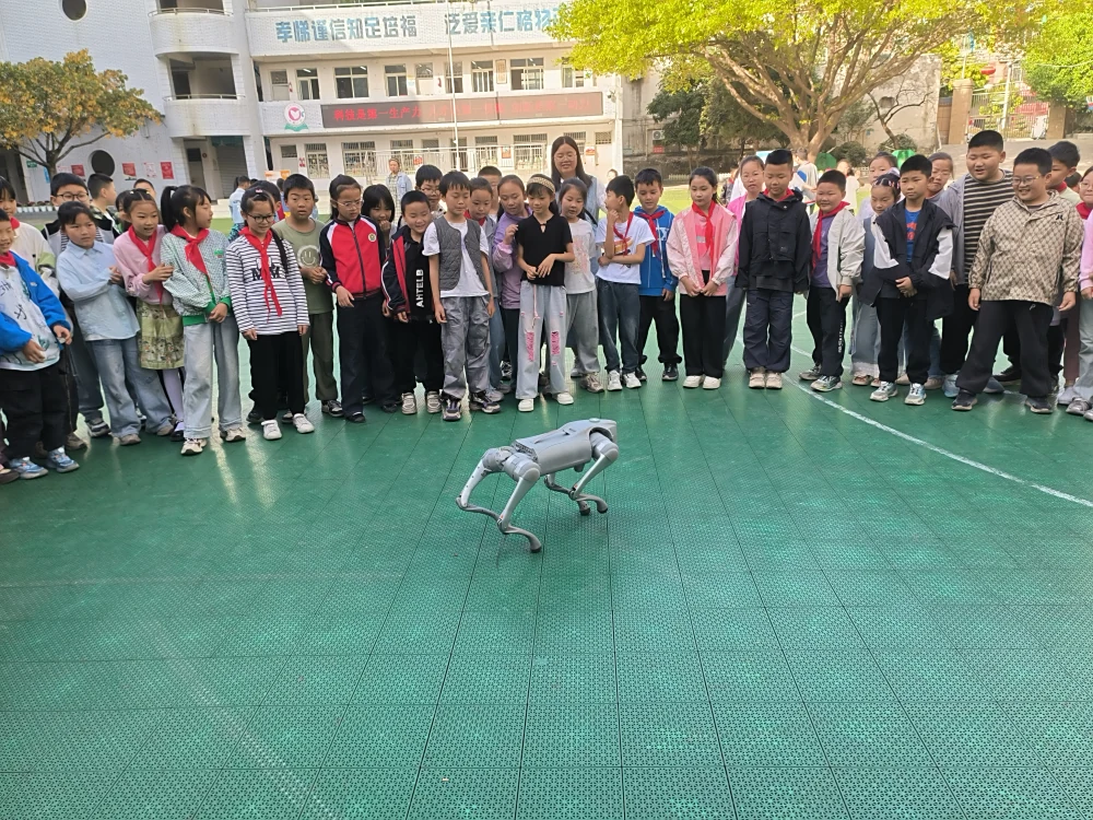 当憨态可掬的智能机器狗登场时,现场瞬间沸腾。这只搭载AI技术的“科技明星”不仅会跳舞、倒立,还能通过语音指令与学生互动。“你好笨笨,握手!”“孩子们争相下达指令,机器狗灵敏的反应和拟人化的动作引发阵阵欢笑。