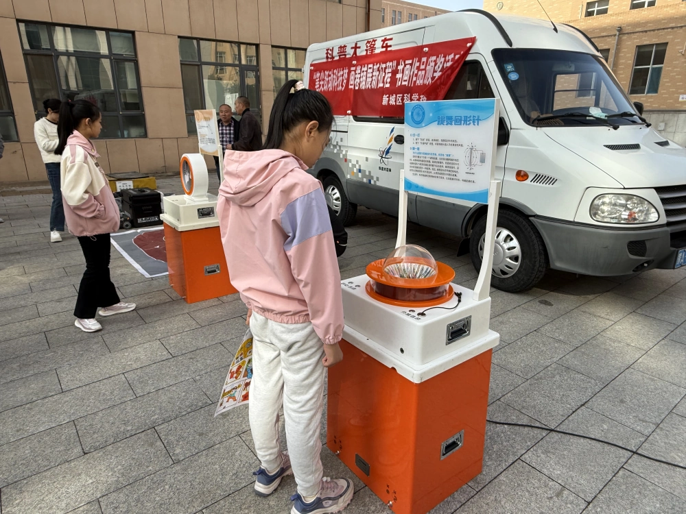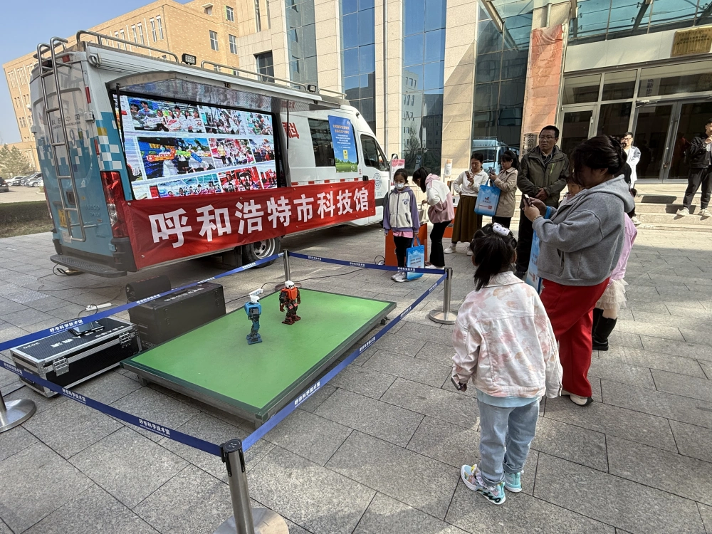 活动现场,科普互动展区精彩纷呈。呼市科技馆大篷车满载新奇的科技展品驶入活动现场,会跳舞的曲别针、正视压力、电磁学互动模型等展品吸引了孩子们驻足围观。孩子们通过亲手操作展品,沉浸式感受科技的神奇魅力。新城区科协带来的智能机器人与灵动的机器狗更是成为全场焦点:机器人随着音乐跳起活力四射的舞蹈,还能与孩子们进行语音互动,解答关于科学知识的疑问;机器狗模仿小狗的动作穿梭在展区,时而打滚、时而作揖,引得现场阵阵欢笑。孩子们在趣味探索中直观感受科学与传统文化的紧密联系。科协工作人员还为同学们发放了科普读物,引导大家培养科学兴趣和创新精神。