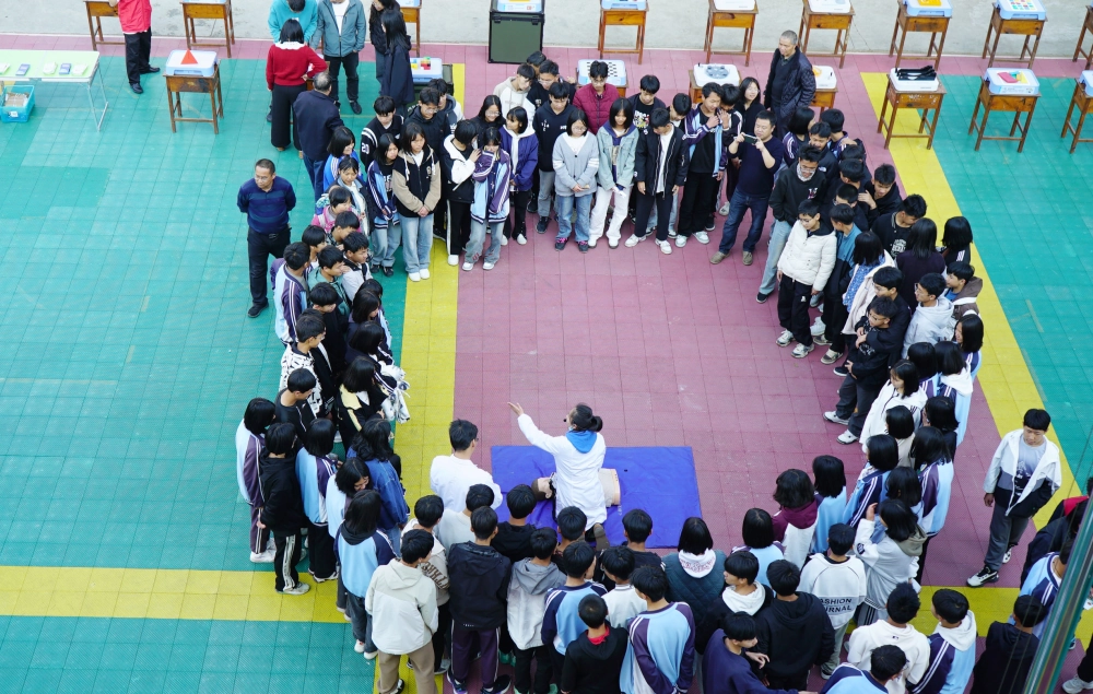 【应急救护课堂:守护生命“救”在身边】市红十字会志愿者现场演示海姆立克急救法、心肺复苏术等实用技能,并组织学生分组练习。通过实操演练,学生们掌握了急救知识,提升了应急处置能力,为生命安全增添保障。
