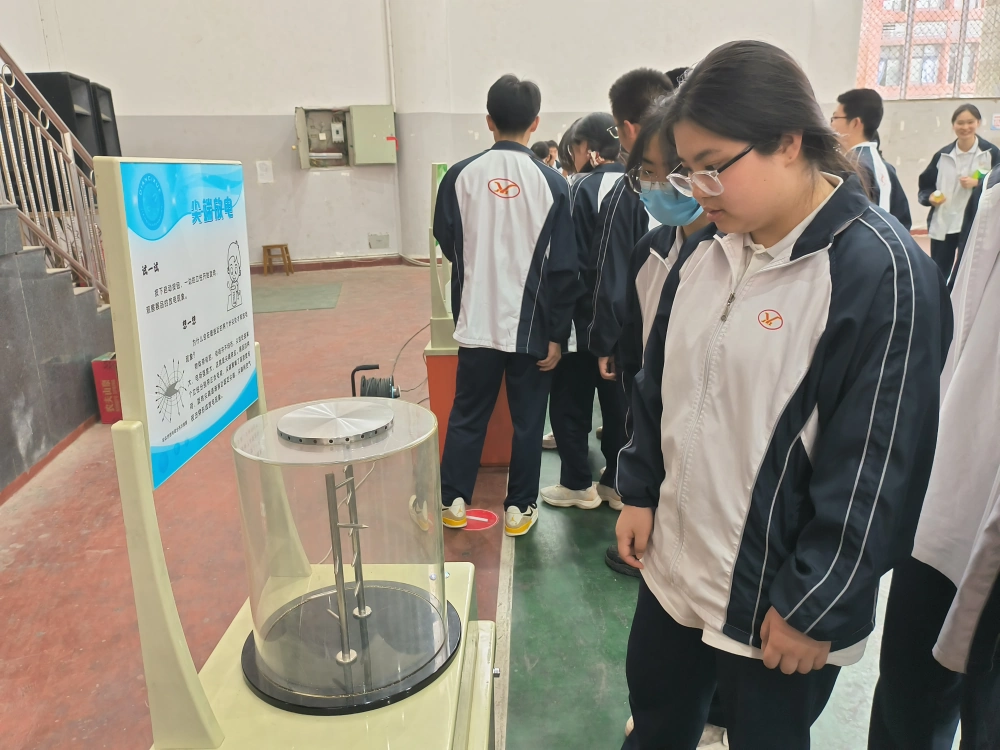 活动现场,涵盖物理学、光学、机械工程等领域的科普展品吸引了众多学生驻足体验。面对“辉光球”“动画”“尖端放电”等装置,江油一中学子展现出扎实的科学素养,不仅动手操作实践,更从原理层面深入分析现象背后的科学规律。学生纷纷表示:“通过“静电乒乓”让我直观感受到电荷分布的规律。”不少学生还能结合课堂所学,用公式推导解释展品现象,体现了理论与实践结合的能力。