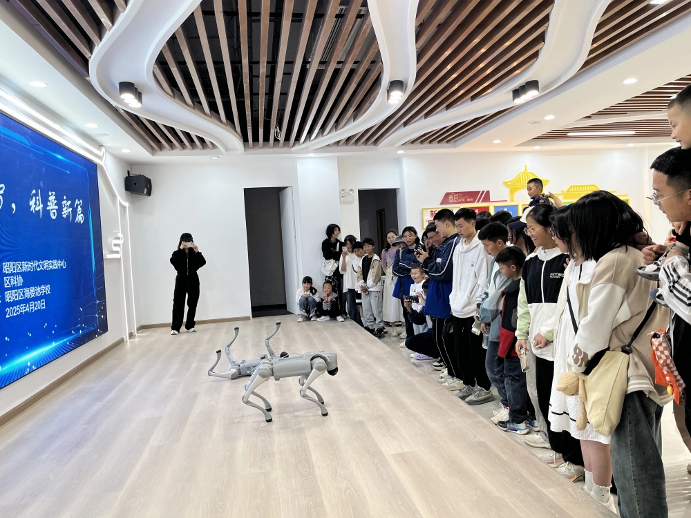 活动现场,昭阳区科协设置了专门的科普宣传展位,通过摆放科普展板、益智小游戏,机器狗表演等形式,向到场的学生、老师、工作人员宣传科学知识。科普展板内容丰富多样,涵盖了健康生活、科技创新等多个领域,以图文并茂的形式展示科学原理和科学成就,吸引了众多学生驻足观看。同时,昭阳区新时代文明实践中心准备了“太阳能直升机”“指南针”等科技类实践操作小模型,这些小模型一亮相就吸引了大量孩子和家长的目光。孩子们在志愿者的指导下,亲手组装模型,探索其中的科学原理,体验科学带来的乐趣。