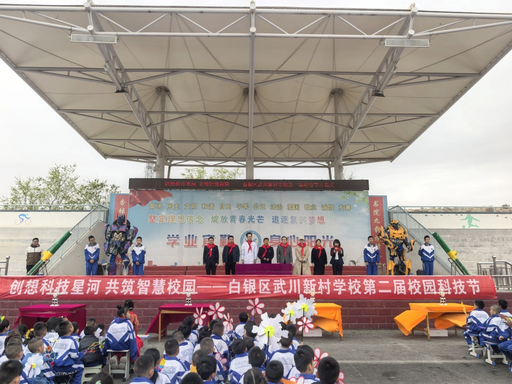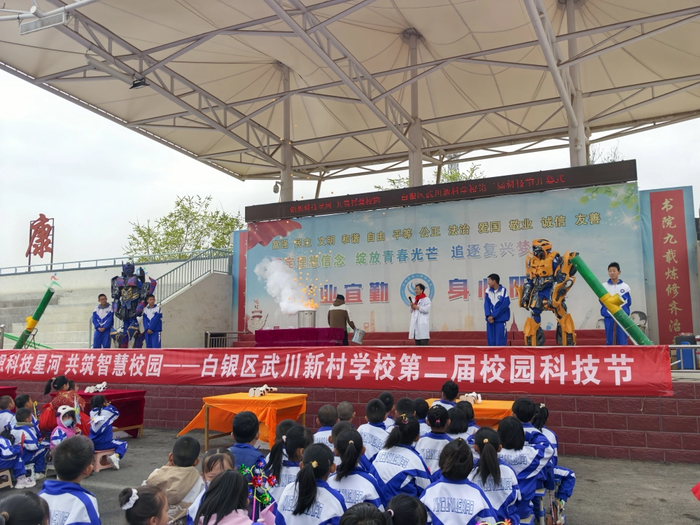 4月21日下午,白银区武川新村学校第二届校园科技节开幕。活动现场,学校邀请白银市科学技术协会和白银赛拓科创团队,为孩子们带来了一系列妙趣横生的科学秀。“氮气礼炮鸣”吸引全场目光,变形金刚挥舞手臂致意,观众的气球和风车欢快飞舞,拉开科技节的序幕。