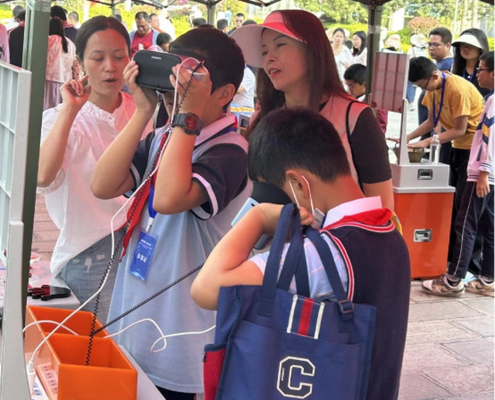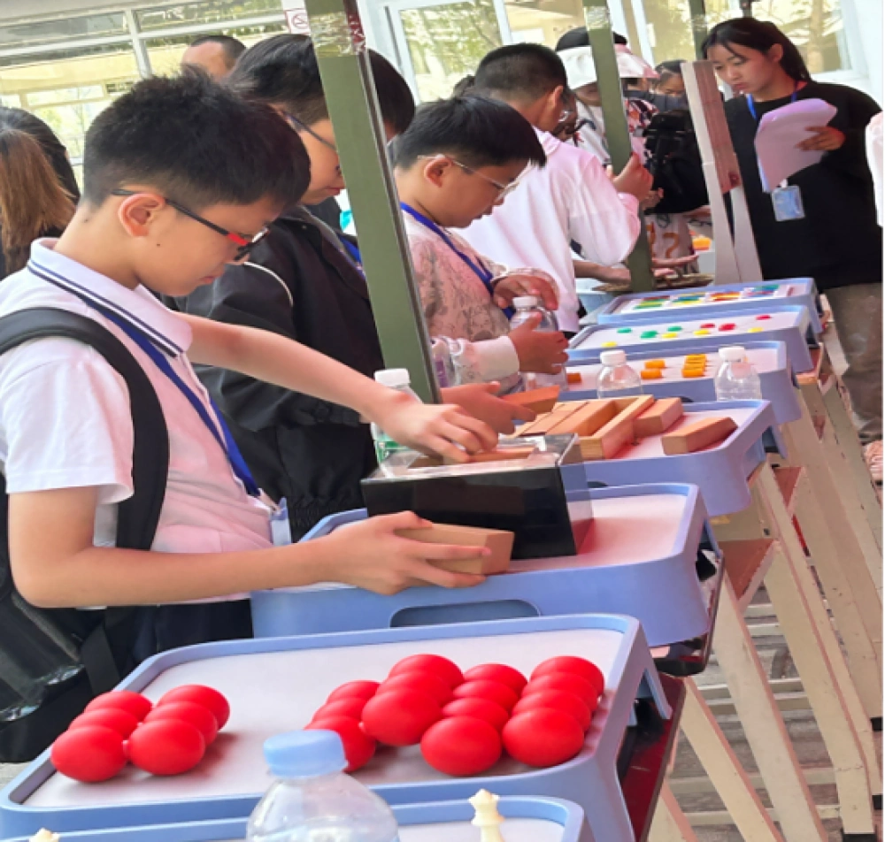 活动现场,孩子们在“电磁加速器”展台前调整电流,观察金属环的悬浮现象;在“声波共振”体验区,通过频率变化探索声音传播规律。VR观测、AI机器人编程、裸眼3D等前沿科技展品更是引发阵阵惊叹,抽象的课本知识化为直观体验。“拓扑益智”类展品则通过拼接挑战,激发孩子们的逻辑思维与创造力。“孩子第一次亲手操作电磁实验,比课堂讲解更生动更容易理解!”一位家长感慨道。参赛学生也表示,互动体验让他们对科学原理的理解更加深刻。