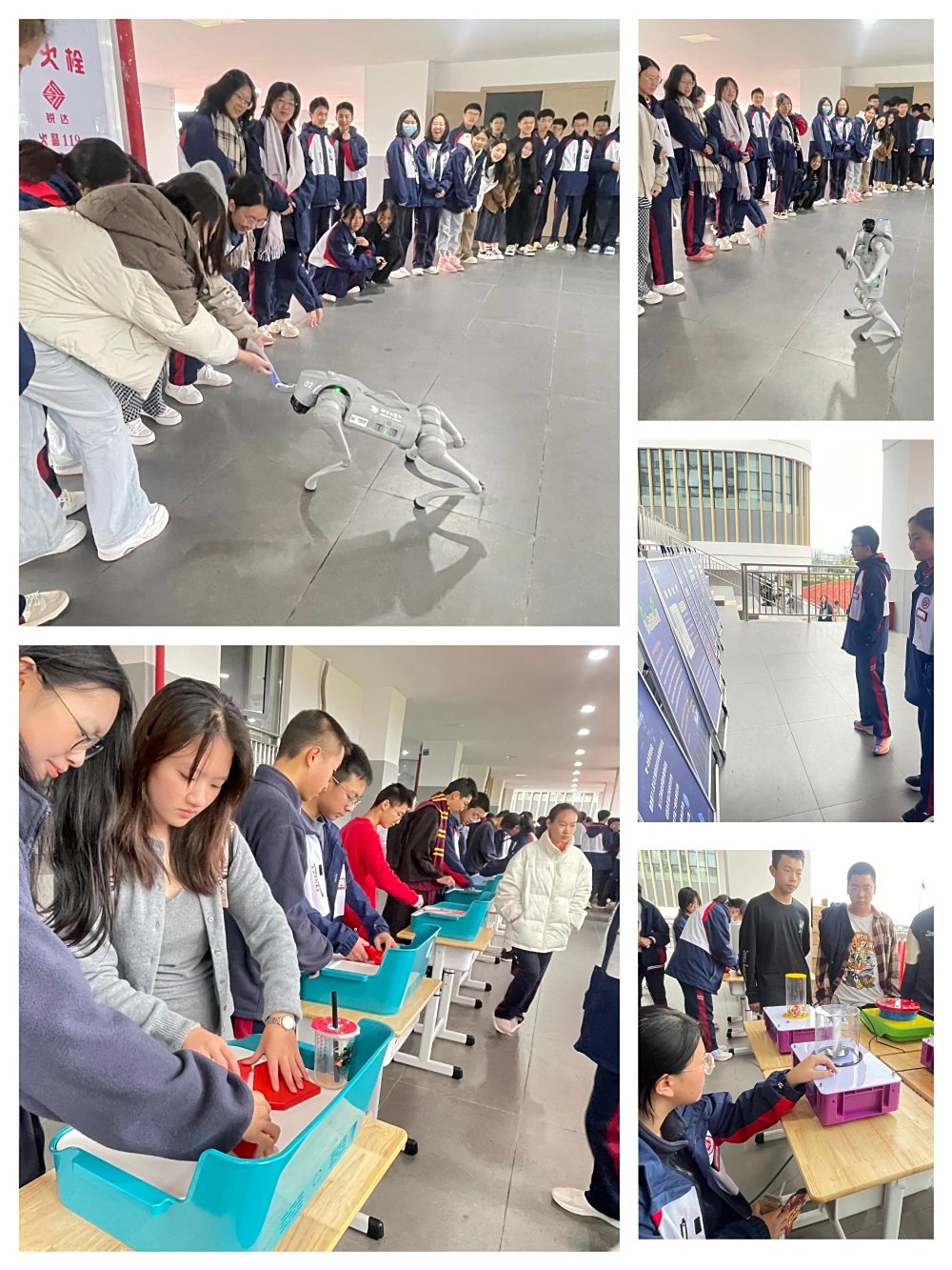 活动当日,3辆满载着科技展品和科普资料的大篷车缓缓驶入校园,瞬间吸引了众多同学们的目光。此次科普活动展品丰富多样,涵盖物理、化学、生物、天文等多个领域,各类互动展品让同学们亲身体验了科学的魅力。科普志愿者们耐心讲解,为同学们答疑解惑,帮助他们深入理解科学知识。“机器狗”的灵动表演和机器人的智能互动,更是将活动氛围推向高潮,同学们的惊叹声此起彼伏。
