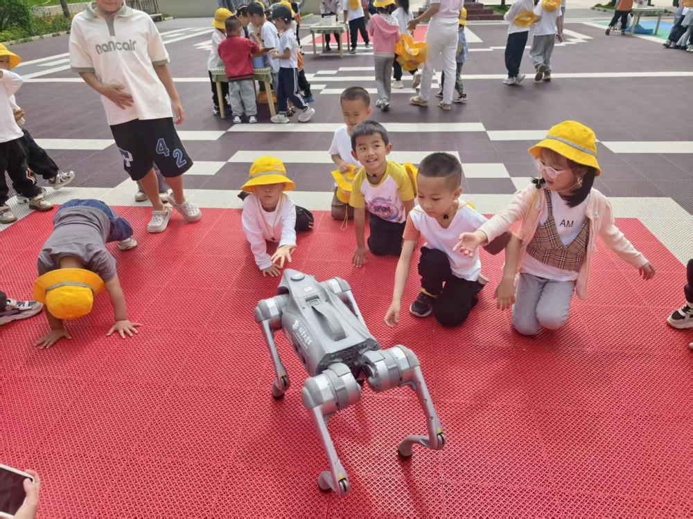 活动展示了能跳舞、能进行简单互动的智能四足机器人,学生们围在机器人周围,观察它是如何运作的,并且与机器人握手互动。机器人的每一个动作都引起了孩子们的一阵阵惊叹,促使他们对于机器人背后的编程和机械原理产生了浓厚的兴趣。
