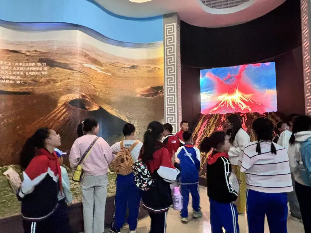 活动最后,研学团队返回察右后旗科学技术馆。师生们首先参观了馆内丰富多样的展区,基础科学展区中,力学、光学、电磁学等经典科学原理通过趣味实验装置生动呈现;航天科技展区里,火箭模型及太空探索纪录片,点燃了学生们的“航天梦”;火山体验展区利用VR技术模拟乌兰察布独特的火山地貌,让学生身临其境地感受大自然的鬼斧神工。参观结束后,结营仪式在馆内举行,主办方为每位参与学生颁发研学活动荣誉证书,肯定其在探索学习中的积极表现。