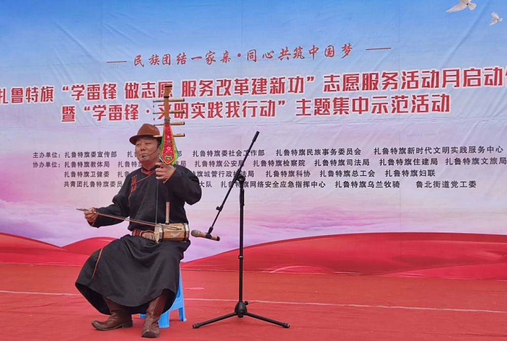启动仪式上,扎鲁特旗科协选送了科普志愿服务队队员达布白拉自编自唱的好来宝节目——《民族团结之赞》。他采用富有地方特色的非遗表演形式,生动地展现了民族团结的重要意义,传递了各民族之间团结友爱、互帮互助的正能量,赢得了现场观众的阵阵掌声。