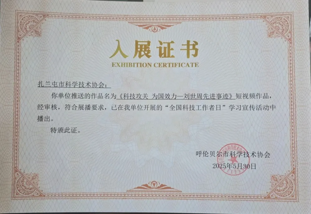 展播过程中,刘世周的先进事迹引发热烈反响。他以科技攻关为己任,将个人理想融入国家发展大局的精神,激励着在场的每一位科技工作者。活动现场,呼伦贝尔市科协为扎兰屯市科协等9家单位颁发《入展证书》,这不仅是对扎兰屯市科协工作的高度肯定,更是对刘世周等优秀科技工作者的致敬。
