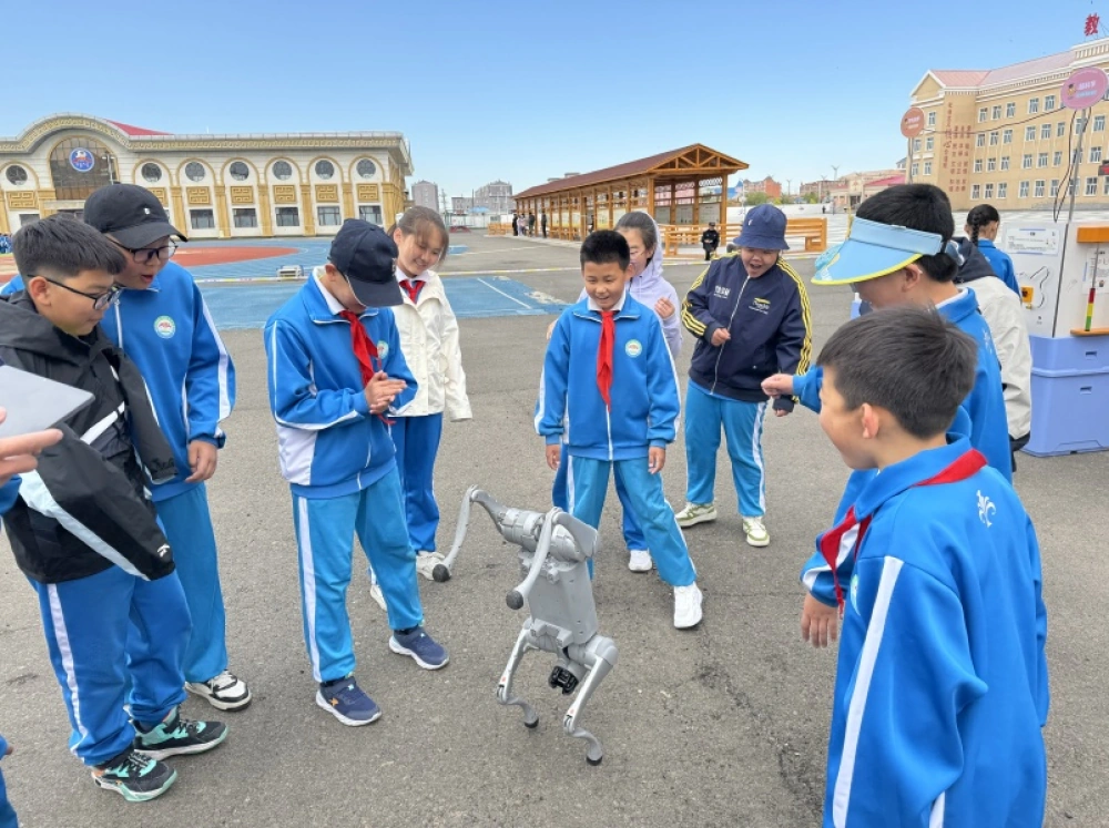 活动的惊喜远不止于此。科普宣传展板错落有致地陈列在操场两侧,图文并茂地展示各类知识。科普志愿者们化身“故事大王”,用生动活泼的语言将深奥的科学原理编织成趣味故事。最令人兴奋的当属机器狗互动环节,萌态可掬的机器狗在工作人员的操控下,完成翻滚、跳跃、后空翻等高难度动作,还能随着音乐节奏“翩翩起舞”。孩子们争相与机器狗互动,触摸它灵活的关节,感受人工智能的魅力,现场气氛被推向高潮。