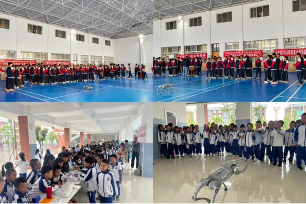在AR体验区,同学们戴上AR设备,仿佛置身于一个全新的世界,亲身感受到增强现实技术的独特魅力。机器人、机器狗等展品也争先亮相,吸引了众人的目光。形态各异的机器人化身“科技舞者”,灵动的机械动作展示了人工智能技术的飞速发展;机器狗敏捷有趣的互动表演则让参观者近距离体验到科技与生活的紧密结合。活动现场,有的同学专注地摆弄着机械装置,有的同学兴奋地围着机器人和机器狗,还有的同学围在科普仪器前热烈讨论……