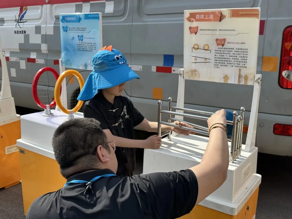孩子们亲眼目睹懒惰环展品的金属环在铜柱上缓慢下滑的“奇特现象”,通过动手实验了解了电磁感应的基本原理,惊叹于看不见的电流也能产生“力”;“磁力传动摆”展品展示了磁力无接触传递动能的神奇过程,让学生们初步理解磁场作用和能量传递的方式;“椎体上滚”用一个会“逆天而行”的锥形体挑战了孩子们的直觉,引发了对重心与动力平衡的热烈讨论。