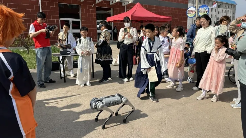 最引人注目的当属“机器狗”的亮相。作为人工智能与机器人技术的代表,机器狗灵巧地行走、跳跃、甚至“打招呼”,让孩子们惊喜不已。它不仅展示了现代工程控制与传感器技术的成果,也引发了学生对AI未来的无尽遐想。