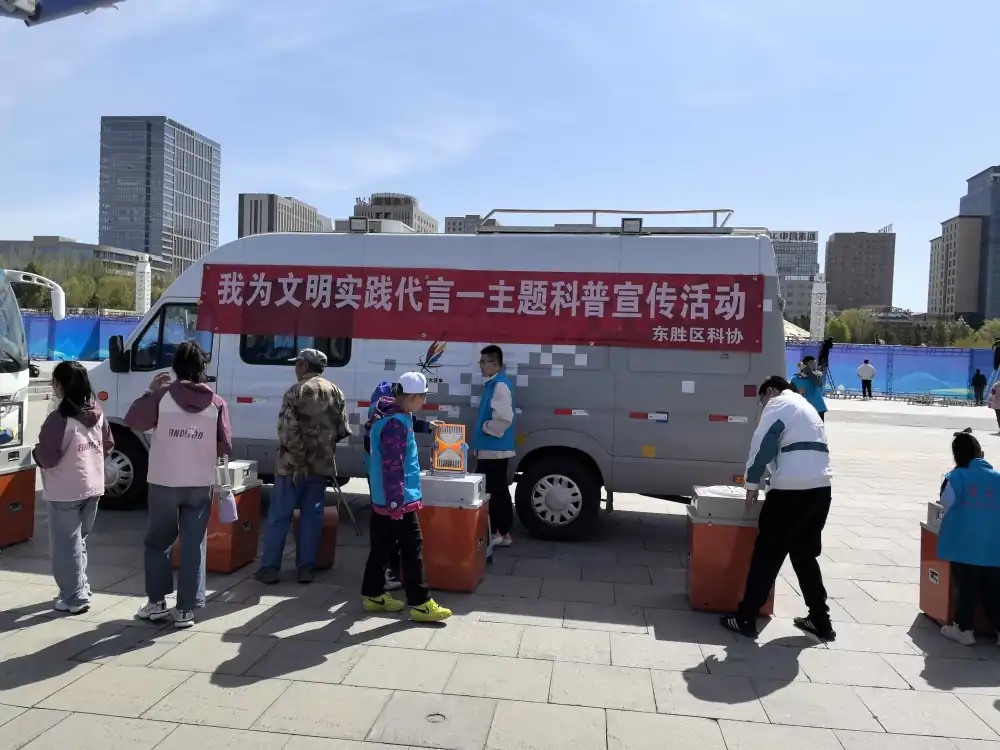 5月11日,“我为文明实践代言”主题活动在鄂尔多斯青铜文化广场正式开启。活动现场,东胜区科协以科普大篷车为载体,通过摆放科普展品、悬挂宣传条幅的方式开展科学普及活动。各类科普展品立即吸引了来往群众尤其是青少年的目光,他们通过动手操作,亲身感受科学的魅力,探索现象背后的科学知识。展台区,科普志愿者向现场群众发放宣传册、宣传品,宣传养生、反诈、应急逃生等科普知识,积极引导广大居民群众关注科学知识,养成科学健康的生活方式,用科学践行文明。