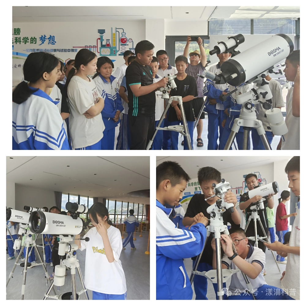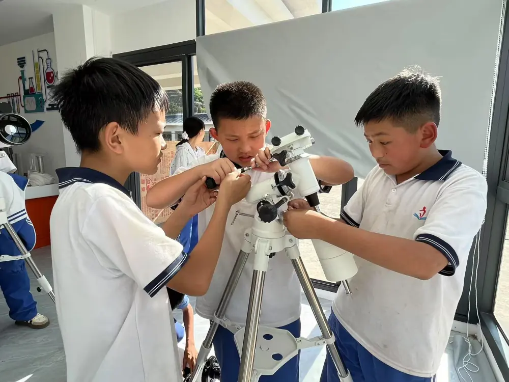 随后,紧张而有趣的组装环节正式开始。科普志愿者们将同学们分成若干小组,每组配备一套天文望远镜组装套件。在志愿者的耐心指导下,同学们小心翼翼地打开包装,对照说明书,仔细辨认每一个零件,有条不紊地进行组装。遇到困难时,大家积极讨论、互相协作,共同寻找解决办法。有的小组在安装镜片时遇到了对焦问题,经过志愿者的现场示范和讲解,迅速掌握了技巧,顺利完成了组装;有的小组则在调整支架角度时出现分歧,通过交流沟通,最终达成一致,成功搭建起稳固的观测支架。在大家的共同努力下,一架架天文望远镜逐渐在同学们手中成型,现场洋溢着兴奋与自豪的氛围。组装完成后,便是令人期待的实操环节。志愿者们详细演示了天文望远镜的操作方法,包括如何调节焦距、寻找观测目标以及使用寻星镜进行精确对准等技巧。同学们迫不及待地轮流操作望远镜,尝试观测校园周边的景物和天空中的飞鸟。当通过目镜看到清晰放大的景象时,大家不禁发出阵阵惊叹,对天文望远镜的神奇功能有了更直观的感受。