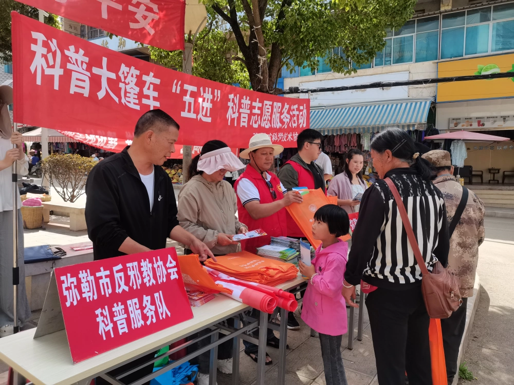 弥勒市科协科普大篷车科普文明实践活动形式多样,科普学习《中华人民共和国科学技术普及法》。弥勒市科协组织通过发放科普书籍200余份、宣传折页100份、宣传编织袋100份、举办科学人员讲解等方式,受众人数约为1200余人。科普活动不仅提高了村民的环保意识、安全意识、垃圾分类、低碳生活等理念,更关注农民的实际需求。活动促进了农村精神文明建设,倡导科学文明健康的生活方式,营造了良好的社会风尚。