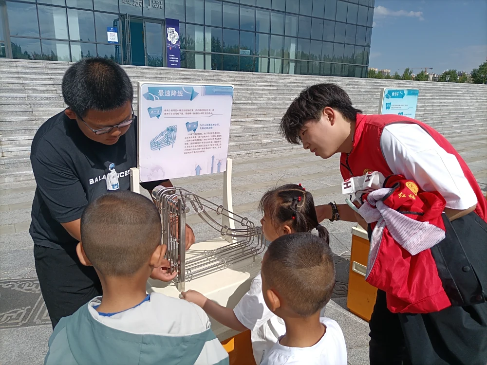 本次活动采用科普展品和宣传展板相结合的形式。活动现场,科普氛围浓厚,科普大篷车停放在科技馆的门口,各类科普展品依次排开,包括天鹅绒触觉、最速降线、锥体上滚、磁力传动摆……这些互动展品涵盖了声、光、电、磁等各类学科知识,集科学性、趣味性、互动性于一体。这些新奇的展品瞬间吸引了到科技馆参观的群众们,不少孩子还积极地亲身实际体验操作,“锥体上滚”违背常理的现象引发阵阵惊叹,孩子们在动手操作与观察中,直观感受到科学原理的奇妙。我馆的科普辅导员在旁边也用通俗易懂的语言为他们讲解展品的操作方法以及包含的科学原理,大家都认真聆听,仔细观察,通过互动提问的方式,加深他们对科学知识的理解,让群众们在学中玩,玩中学,沉浸式感受科技的的神奇力量。