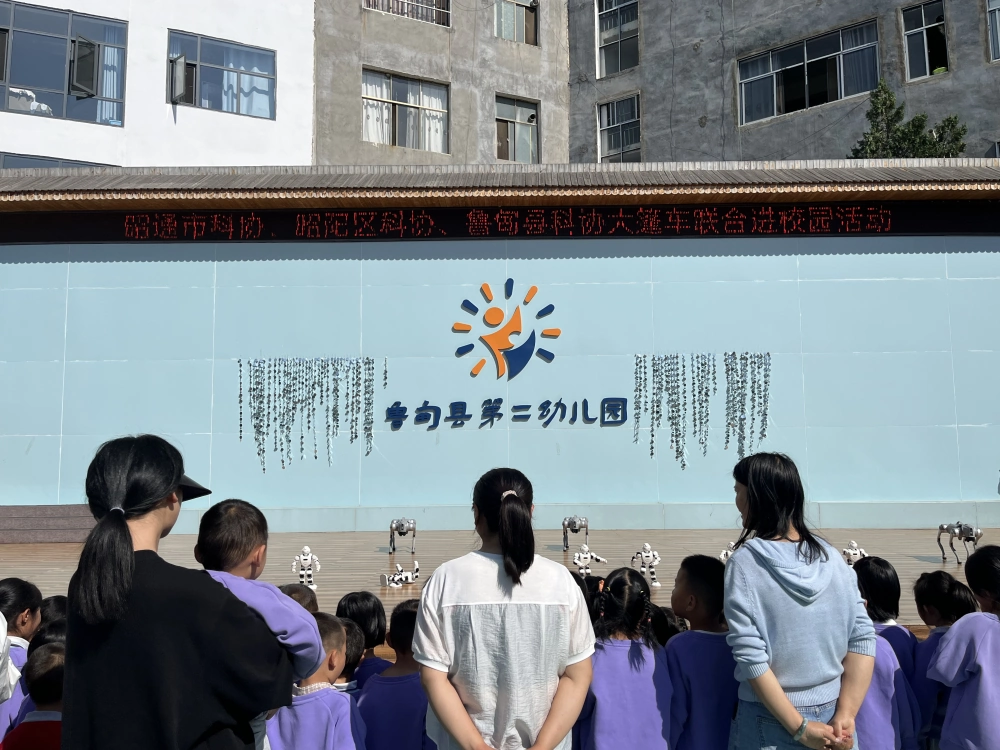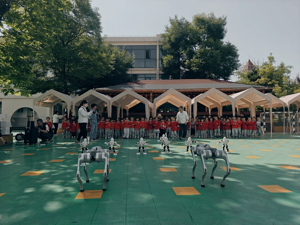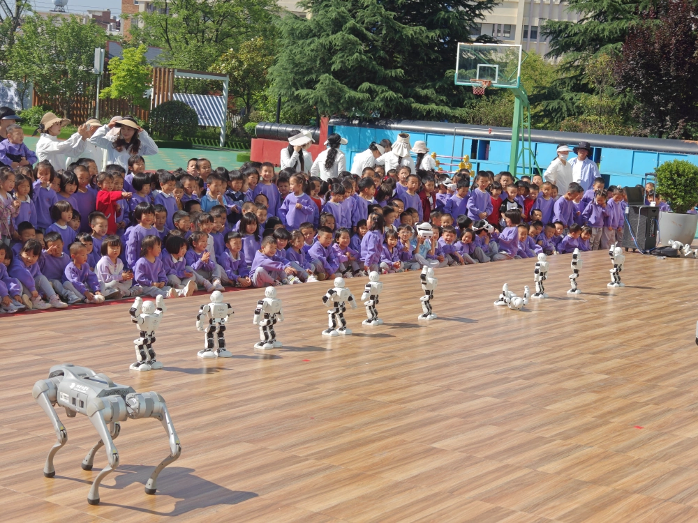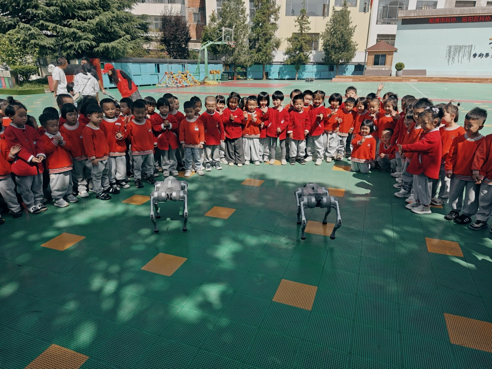 在幼儿园的操场上,一片欢声笑语中,一场别开生面的科普活动即将拉开帷幕。阳光透过学校设施洒在操场的地板上,形成一片片明亮的光斑,仿佛也在为这场奇妙的科技探索之旅加油助威。舞台中央,排列着两排特别的“嘉宾”——机器人、机械狗。机械狗在工作人员的操控下关节灵活地向小朋友们招手互动做自我介绍,随后便化身功夫小子,翻跟头、跳跃、奔跑……孩子们围坐在一起,瞪大着眼睛,在机械狗的精彩表演中爆发阵阵欢呼声。而与此同时机器人则安静的站在一旁,它们的“眼睛”闪烁着柔和的光芒蓄势待发,伴随着音乐响起,机器人们也毫不示弱的迈着稳健的步伐整齐划一的跳着机械舞,它们的动作虽然简单,但也充满科技的魅力,让孩子们的目光紧紧地跟随着他们。在这一刻,幼儿园的操场上充满了科技的氛围,孩子们的好奇心和探索欲被彻底点燃。