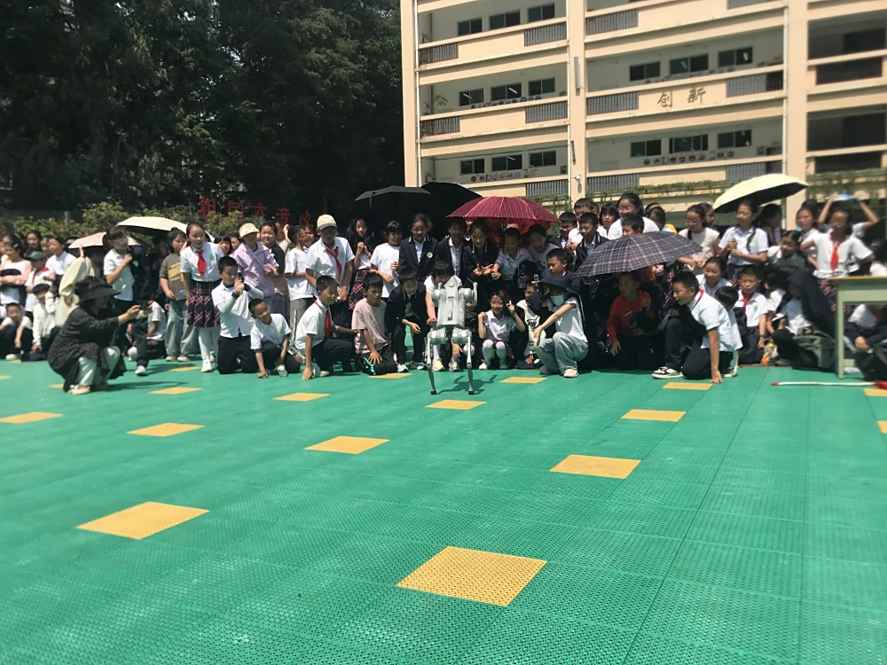 在室外进行的大篷车展示环节,大篷车搭载的机器狗智能设备进行动态表演,灵活的机械动作、精准的路径规划引得师生们阵阵惊叹。孩子们围拢在展品旁,在科普志愿者的指导下亲手操作,近距离观察,探索科学奥秘。科普志愿者结合展品特点,用通俗易懂的语言讲解人工智能、机器人技术等前沿科技知识,引导学生们思考科学与生活的联系。“机器狗居然能跟着指令做前进、后退、旋转、蹲坐、俯卧撑等高难度动作!”学生们兴奋地交流着体验感受。