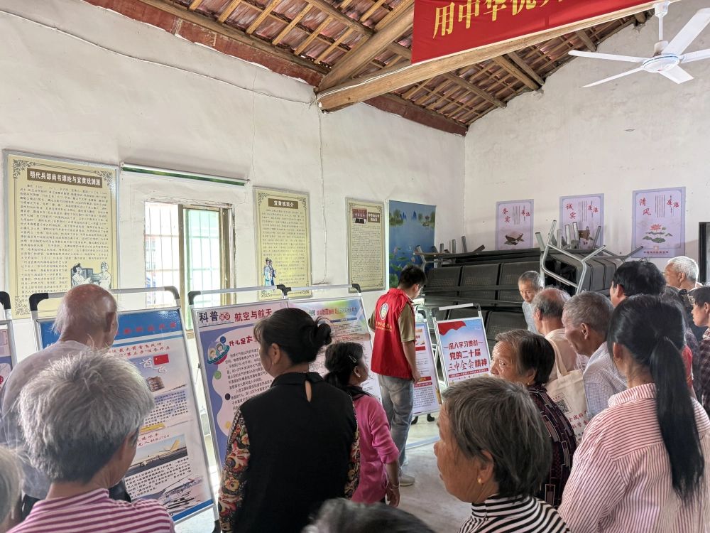 活动现场,科普展板整齐排列,内容涵盖应急救护、二十届三中全会精神解读、防溺水安全教育、健康饮食指南、航天航空知识等多个领域。科普志愿者用通俗易懂的语言为村民讲解实用知识,比如“海姆立克急救法如何操作?”、“夏季防溺水要注意哪些事项?”村民们纷纷驻足聆听,时不时提问交流,现场氛围热烈。