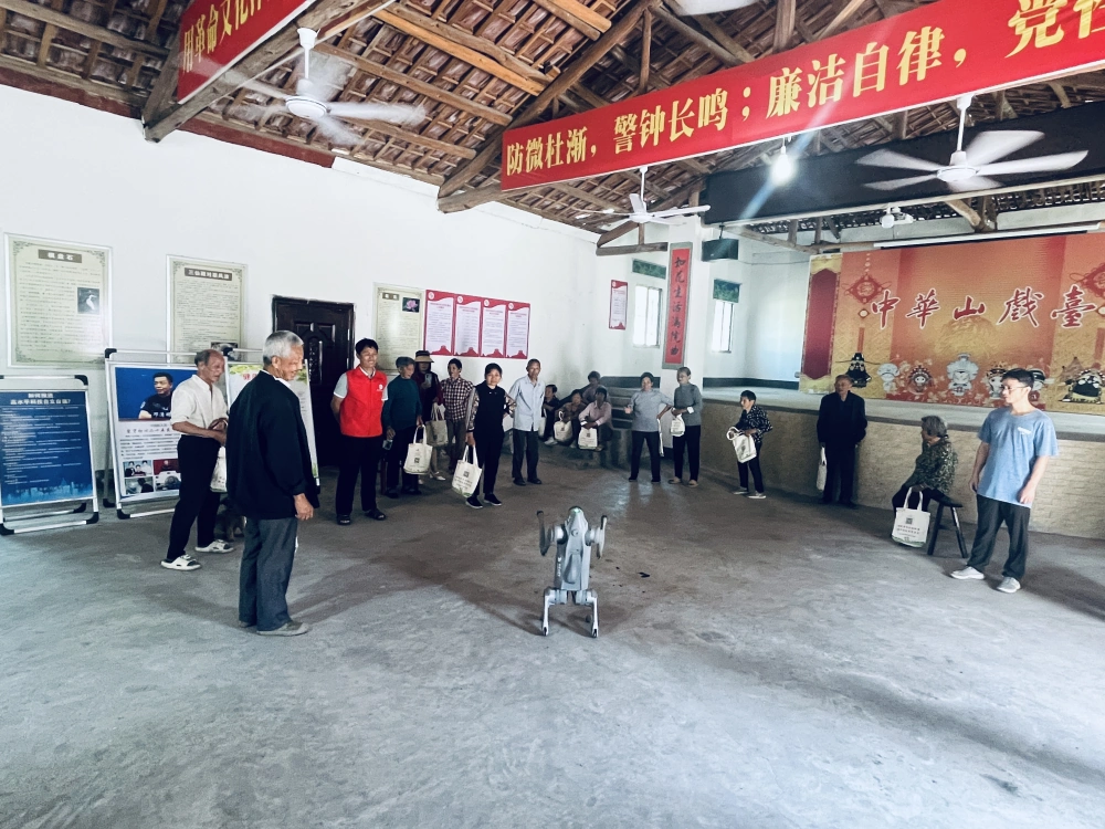 “快看,这机器狗会翻跟头!”随着一阵欢快的笑声,智能机器狗的表演成为全场焦点。灵活的动作、智能的反应,让村民们近距离感受到科技的魅力,围着机器狗好奇观察,工作人员借此机会向大家普及人工智能技术在日常生活中的应用,点燃了乡村居民对科学的兴趣。