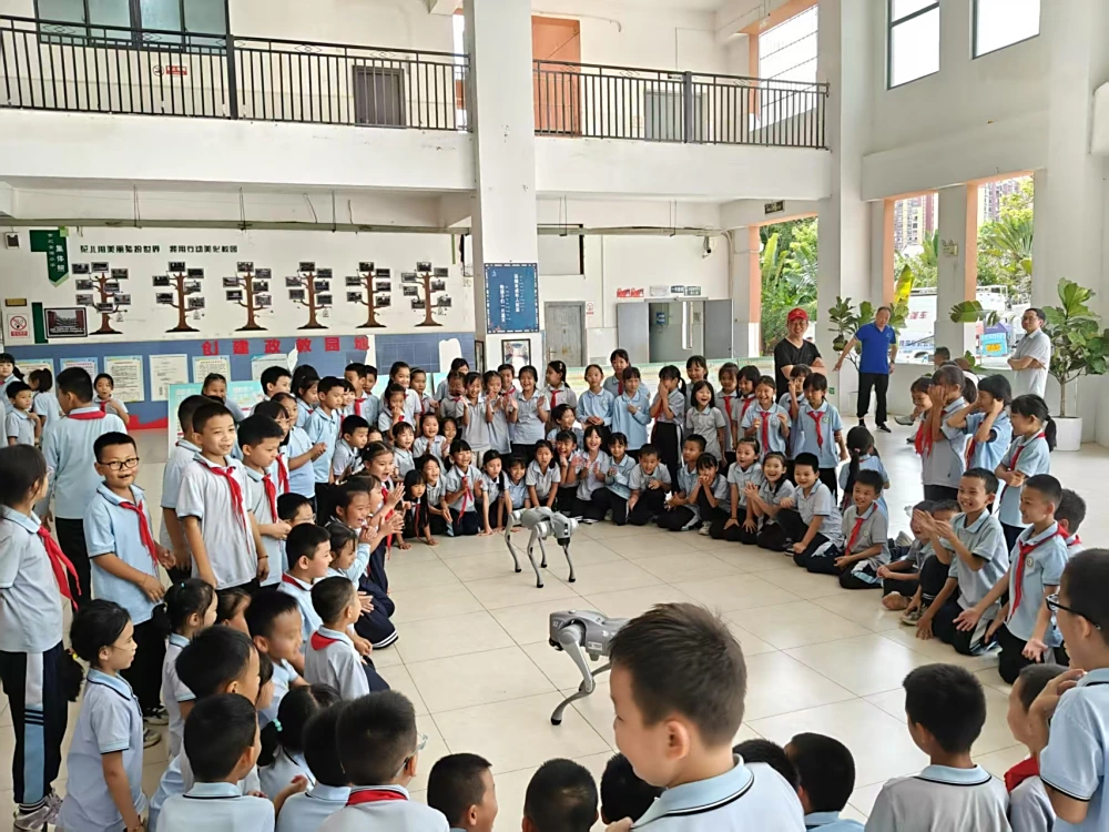 科普大篷车刚一亮相,就吸引了众多师生的目光。工作人员迅速将车内精心准备的科普展品布置好,瞬间搭建起一座 “移动科技馆”。展品涵盖物理、化学、生物、信息技术等多个学科领域,种类丰富,形式多样。从基础科学原理展示到前沿科技体验,每一件展品都设计巧妙,旨在激发孩子们对科学的好奇心与探索欲。而最受孩子们欢迎的,当属智能科技展区的各类机器人表演。机器狗灵活地跳跃、翻滚、行走,动作流畅自然,引得现场欢呼声、掌声不断。这些机器狗不仅能完成各种高难度动作,还能与同学们进行简单的互动,人形机器人的舞蹈表演也毫不逊色,它们跟随欢快的音乐节奏,整齐划一地做出各种舞蹈动作,精准的动作控制和富有创意的舞蹈编排,让孩子们感受到了人工智能与机械技术的完美结合。