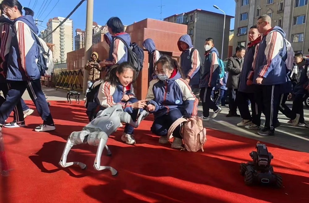 除了丰富的展品,机械狗和机甲大师的精彩表演将活动推向了高潮。机械狗灵活的身姿、精准的动作,展示了人工智能和机器人技术的融合成果。它不仅能完成各种复杂的指令,如跳跃、翻滚、奔跑,还能与学生们进行互动,引得现场阵阵欢呼。机甲大师的对战表演同样扣人心弦,这些小巧却功能强大的机器人在地面上灵活移动、精准射击,展现出强大的竞技能力,让学生们仿佛置身于未来科技战场,充分领略到AI技术在机器人领域的应用魅力。
