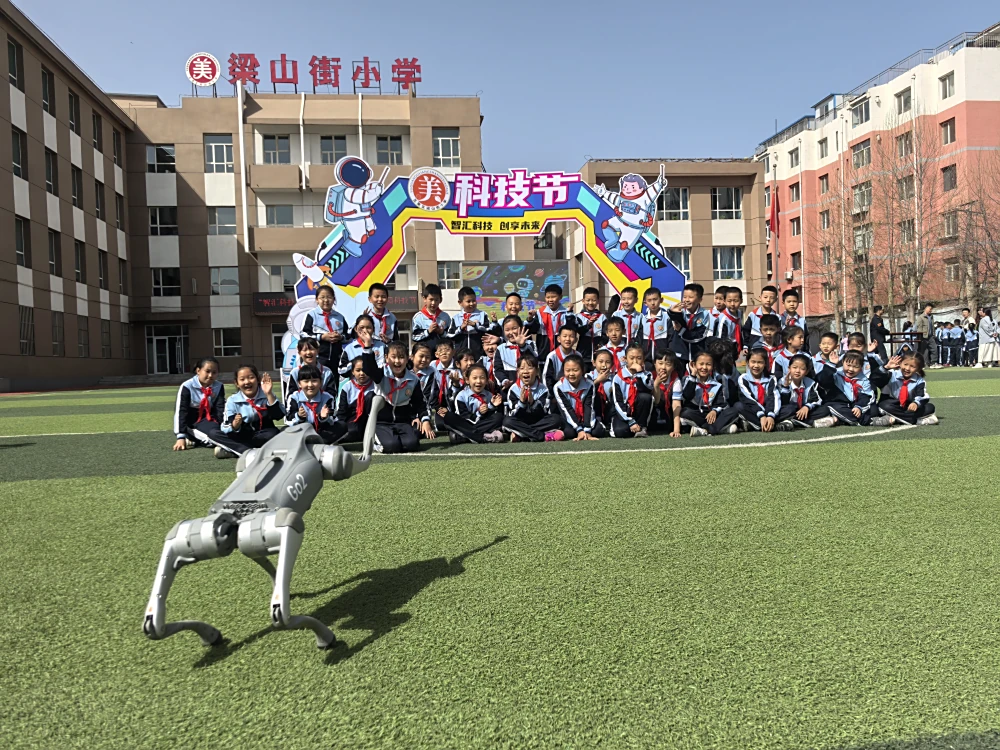 除了科普展品外,科普大篷车还带来了精彩的“机器狗”表演,这只会握手、翻跟头的智能机器人一出场便引发了同学们的欢呼,科技辅导员操纵着机器狗在场地中间灵活的完成“握手”“比心”“翻跟头”“跳舞”等高难度动作。