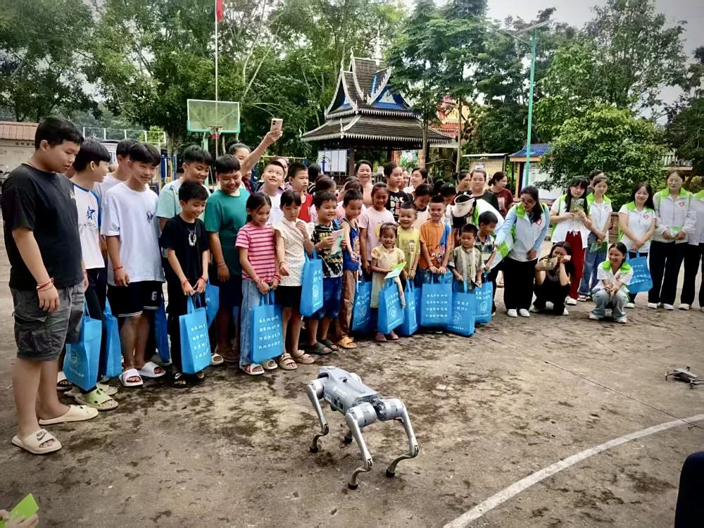 在曼飞龙小组的社房活动场上,科普大篷车带来的科技展品成了全场焦点,机器狗在科技志愿者的操控下,时而迈着灵活的步伐穿梭在孩子们中间,时而做出拜年、打滚等憨态可掬的动作,引得围观的傣族村民和小朋友们欢呼雀跃。