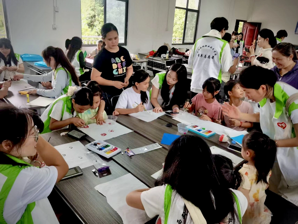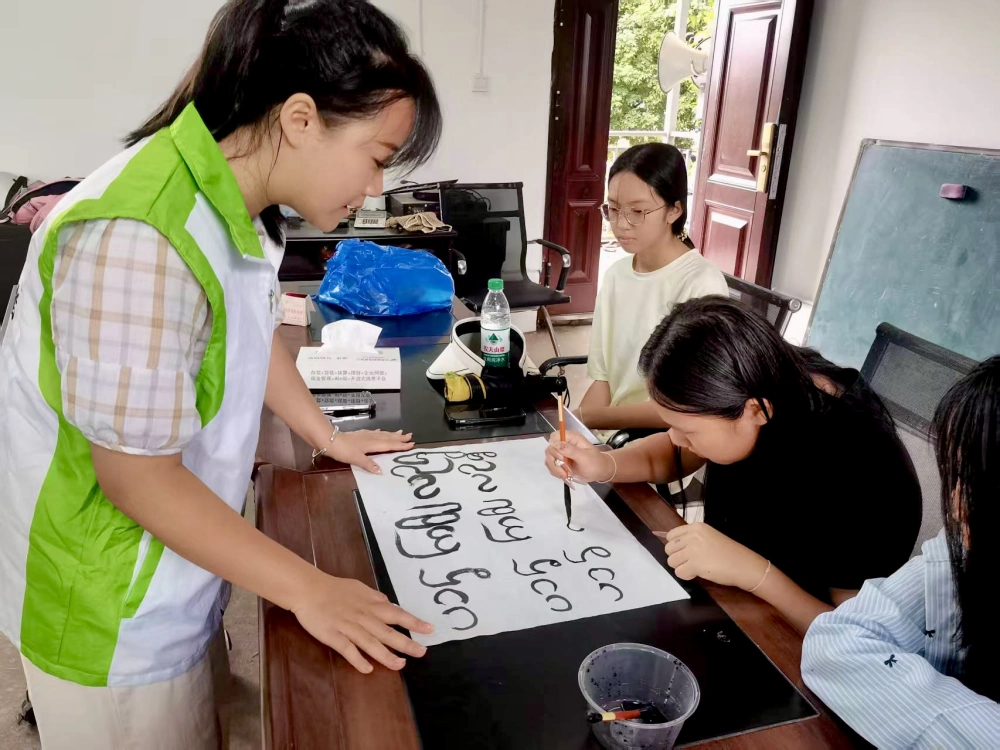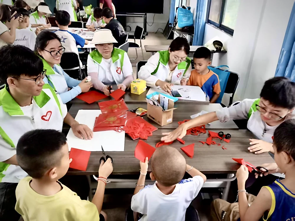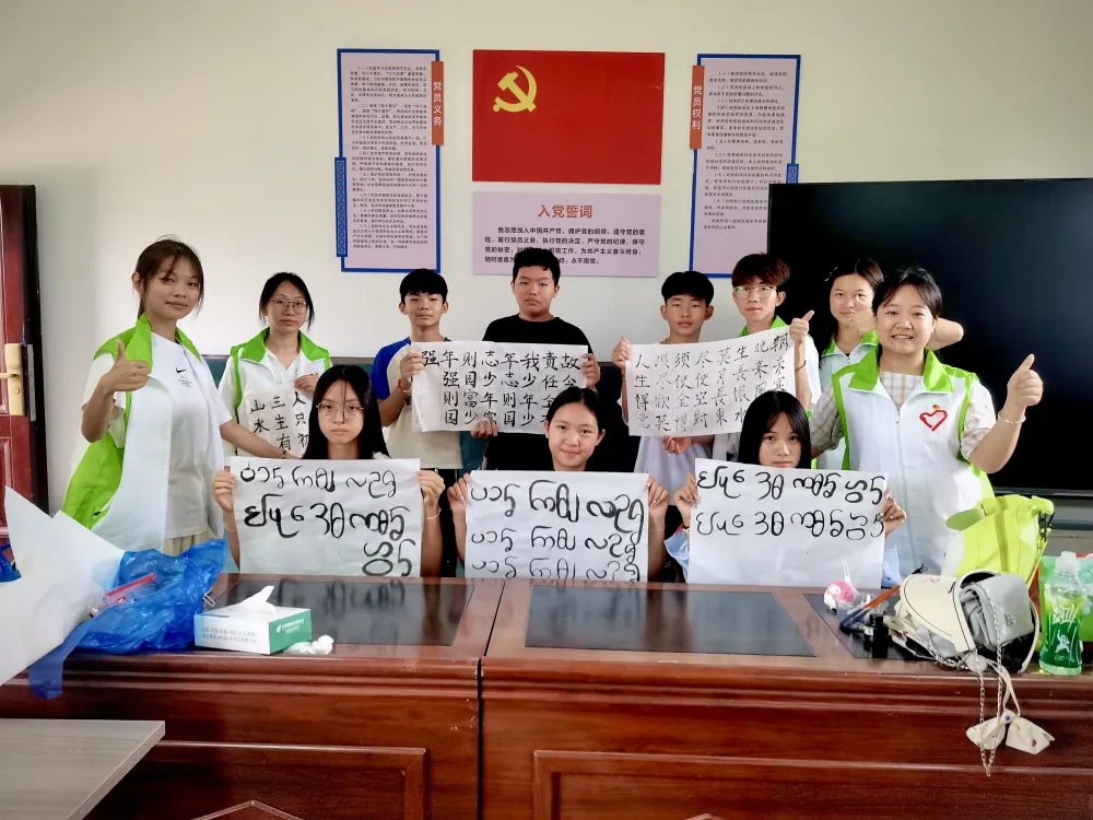 在文化活动室里,另一番热闹景象同样动人。西双版纳职业技术学院的志愿者们与科协工作人员一道,摆开了 一场别开生面的“文化课堂”。志愿者手把手教孩子们剪傣族传统纹样的窗花,在折叠纸张的过程中讲解 “对称图形” 的科学原理;用毛笔蘸着墨汁,教孩子们在纸上书写傣文短句 ——“吉祥如意”,一笔一划间,民族文字与科普讲解完成了一次温暖的碰撞。