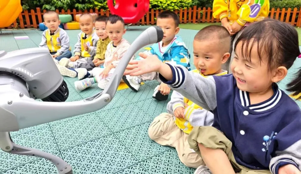 随着智能机器狗“笨笨”的闪亮登场,活动现场瞬间沸腾。这只科技感十足的智能伙伴,时而灵巧地穿越障碍,时而随着音乐翩翩起舞,时而与孩子们亲密互动。它憨态可掬的表现引得孩子们欢呼雀跃,纷纷伸出小手与这位“科技明星”亲密接触,在欢声笑语中感受人工智能的魅力。